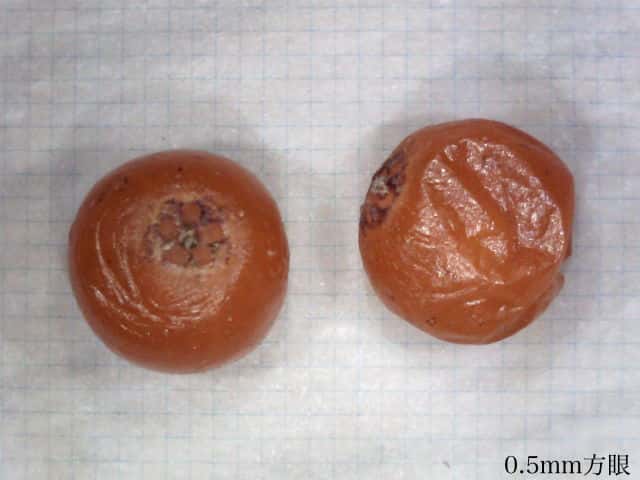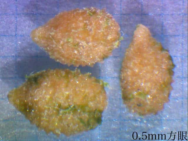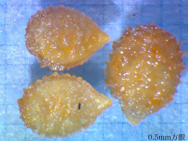 | ▼核が3個あり、長さ2.2〜2.5mm。 | ▼核の表面に凹凸がある。 | |
