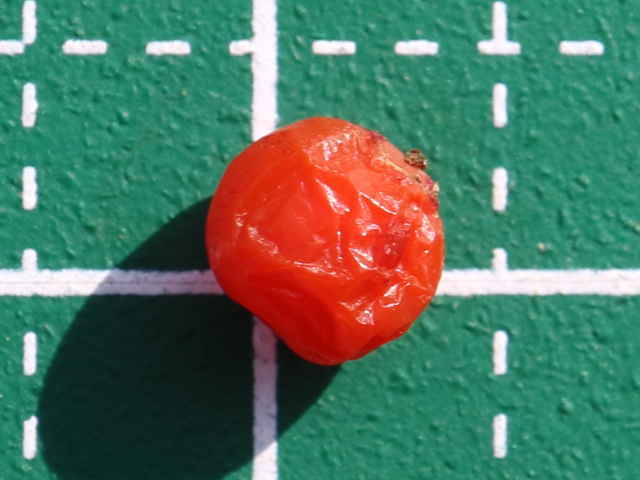 | ▼果実は直径約5mm。 | ▼核が3個入る。長さ約2mm。 | |