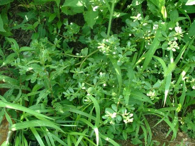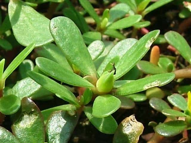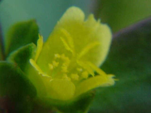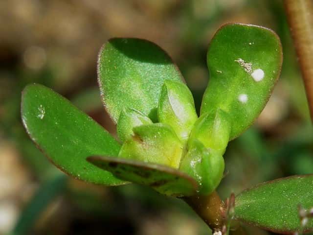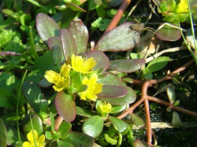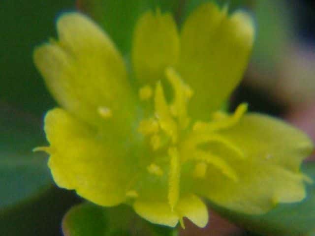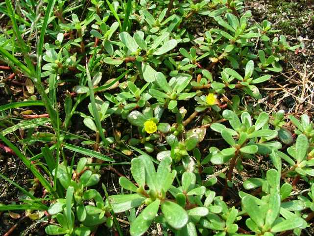 | 1年草 日本全土の日当たりのよいところに多い。茎は赤紫色を帯び、地をはって広がる。葉は長さ1.5〜2.5cmのへら状で基部はくさび形。花は黄色で直径6〜8mm。日が当たると開き、暗くなると閉じる。花弁はふつう5個。萼片は2個。果実は熟すと横に裂け、上部が脱落する蓋果で、長さ約5mm。中には黒い種子が多数入っている。花期は7〜9月。(野に咲く花) 茎は円柱形で平滑、帯褐紅色を呈し、長さ15〜30cm、散開して分枝し、下部は倒れ伏し、上部は斜上する。葉は互生し、長さ15〜25mmで、くさび形をおびた長楕円形。花は数個、枝の先に集まった数個の葉の中心につき、無柄。萼片は2個、緑色で、背部に稜がある。花弁は黄色、小型で、散りやすく、倒卵形で先はへこみ、萼の外にわずかに出る。雄しべは7〜12個、柱頭は5〜6裂する。種子はゆがんだ円形で、黒色、縁はざらつく。(日本の野生植物) 学名は、Portulaca oleracea スベリヒユ科スベリヒユ属 |