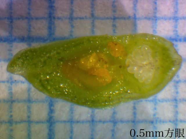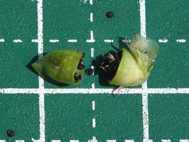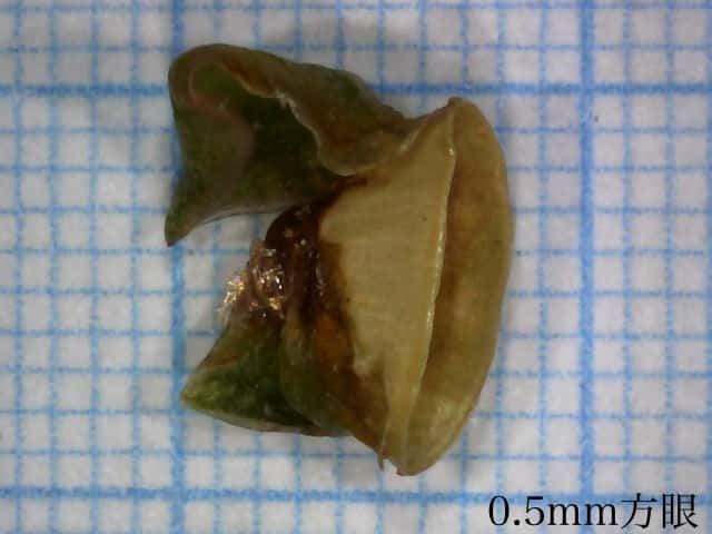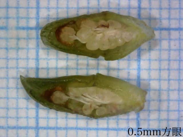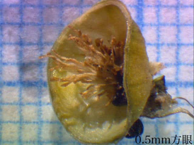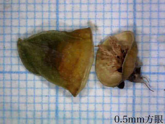 | ▼果実の上部は萼に包まれている。 | ▼萼をとると果実の上半部がある。 | ▼種子は長さ0.6〜0.7mm。 |