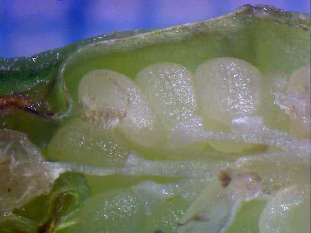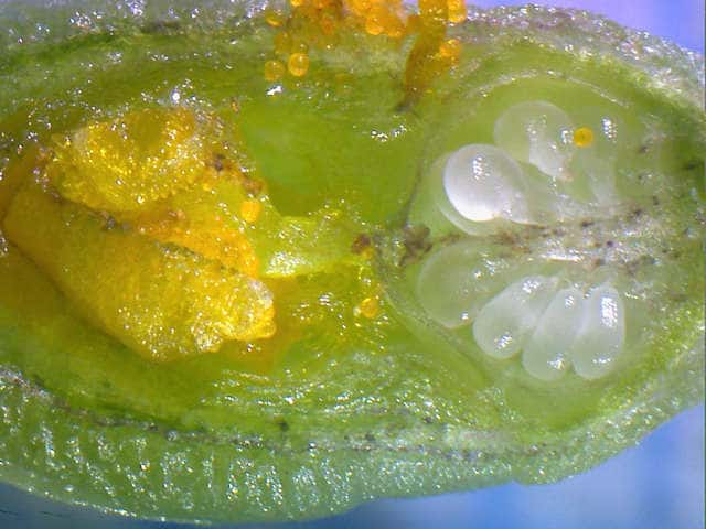 | ▼若い果実の縦断面。 | ▼萼の中で果実が上に伸びている。 | ▼種子に長い種柄がある。 |