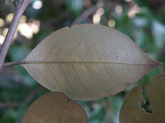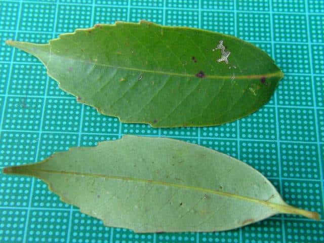 | ▼2017年11月13日 鋸歯のある葉。 宍道 | ▼葉先は長く尖り、捩れている。 | ▼裏面は光沢がある。 |