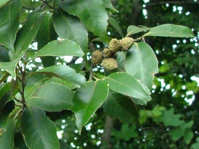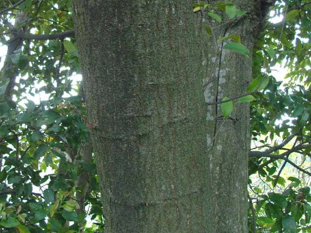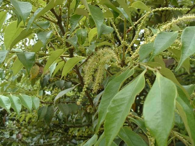 | 常緑高木 福島・新潟県以西〜九州の山地に生える。高さ約20m、直径1mほどになる。幹は上方でよく分枝して、まるみのある大きな樹冠をつくる。樹皮は黒褐色。大木になると縦に深く裂け目が入る。新枝は褐色を帯びた灰緑色。円形の小さな皮目が多い。葉は互生。2列に並び、やや斜めの下向きにつく。葉身は長さ5〜15cm、幅2.5〜4cmの広楕円形で、厚い革質。先端は急に細くなって尾状に長く伸び、基部は広いくさび形。全縁または上半部に波状の鋸歯が少しある。表面は光沢のある深緑色、はじめ淡褐色の細かい垢状の毛が散生するが、まもなく無毛になる。裏面には灰褐色の細かい垢状の毛が密生する。葉柄は長さ1cmほど。托葉は開葉後まもなく落ちる。雌雄同株。虫媒花なので、花期には強い香りを発散する。雄花序は長さ8〜12cm、新枝の下部から上向きに伸びるが、花序の軸が繊細なので先端は垂れる。雄花は膜質の苞の脇に普通1個つく。花被は直径3mmほどの半球形。雄しべは10〜12個。雌花序は長さ6〜10cm、新枝の上部の葉腋から直立し、雌花が多数つく。雌花の基部は直径約1cmの椀状の総苞に包まれる。花柱は3個。果実は堅果。長さ1.2〜2cmの卵状長楕円形で、翌年の秋に成熟する。堅果ははじめ殻斗に包まれているが、成熟すると殻斗は3裂し、中から堅果が顔を出す。殻斗の外面には鱗片が同心円状に並ぶ。花期は5〜6月。 冬芽は、やや扁平な長楕円形。(樹に咲く花) 学名は、Castanopsis sieboldii ブナ科シイ属 よく似たツブラジイ(コジイ)は堅果が長さ6〜13mmと小さく、樹皮に深い割れ目ができない。 |