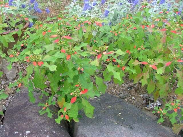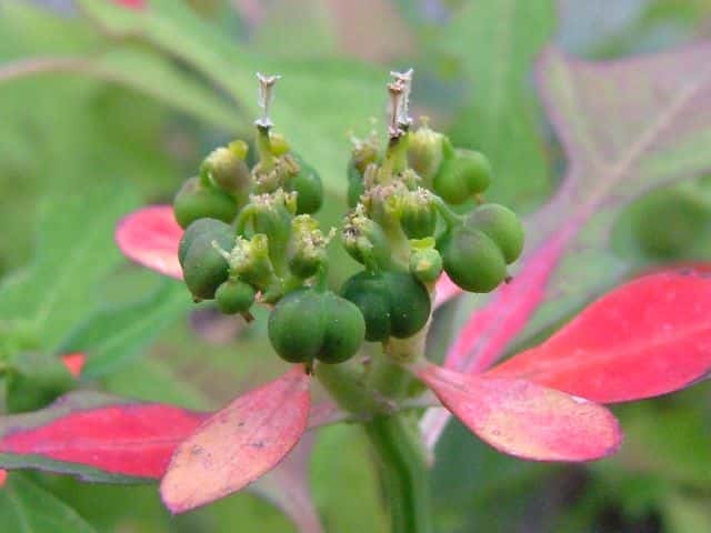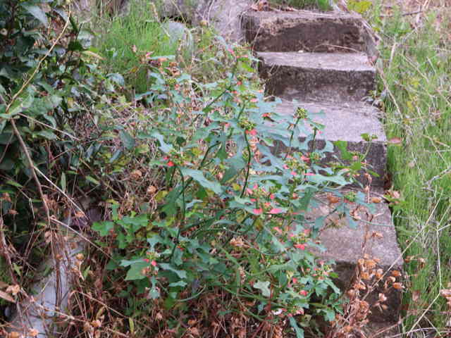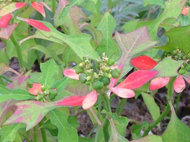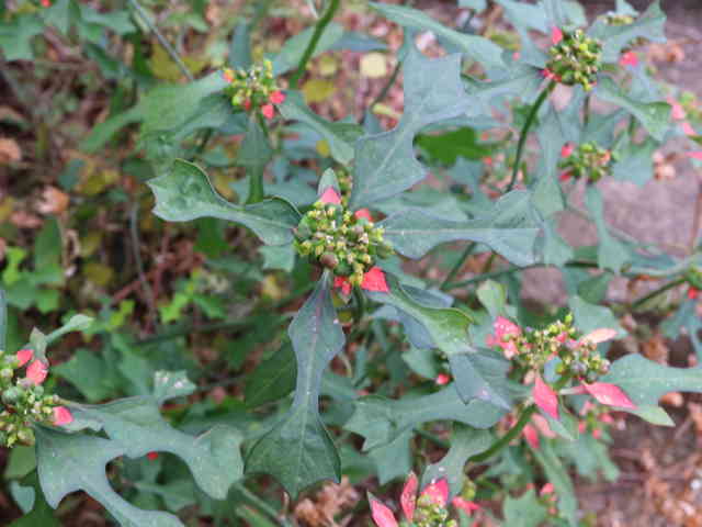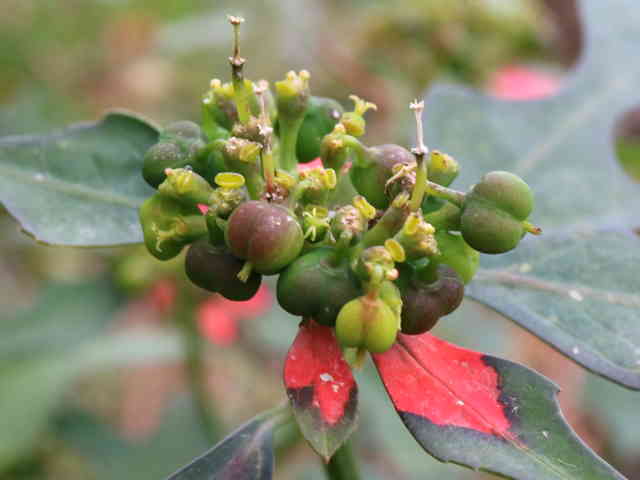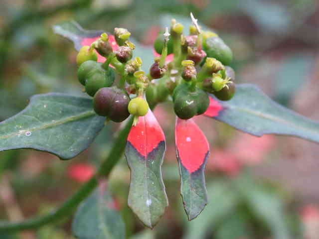 1年草 アメリカ(合衆国中部〜アルゼンチン)原産で、園芸用に栽培され、ときに逸出する。茎は直立する。葉は腺状の托葉をもち、不規則な浅い鋸歯がある。茎葉は互生し、葉柄は1.5cm以下、下部の葉は披針形、上部の葉は独特のバイオリン形をしており、基部が朱色に色づく。茎の先端に葉を対生し、杯状花序を集散状に配置した花序をつける。杯状花序の苞葉は対生し、独特のバイオリン形をしており、基部が朱色に色づく。総苞の腺体はふつう1〜2個で、横長楕円形で、中央がへこむ。さく果は平滑で無毛。裂開後に宿存する柱状体は長さ約2.5mmである。種子は卵形で、こぶ状突起があり、長さ約2.8mm、幅約2.2mm。花期は夏。(日本の野生植物) 学名は、Euphorbia cyathophora トウダイグサ科トウダイグサ属 |