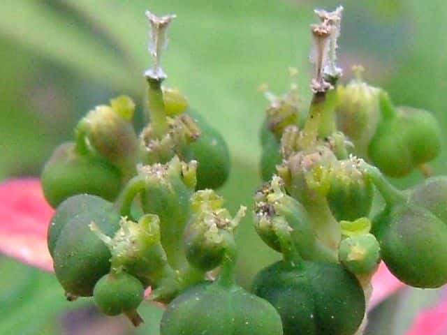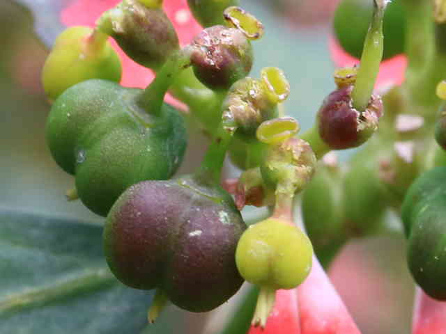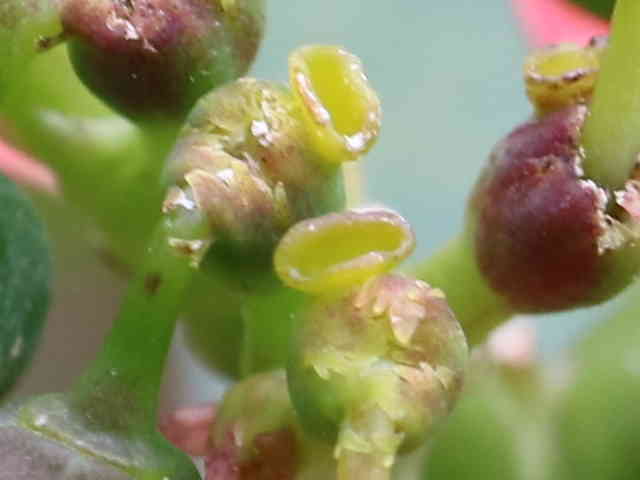 | ▼2017年11月21日 果実 島根 | ▼苞の一部が赤くなる。 | ▼花序に1個の黄色い腺体がある。 |