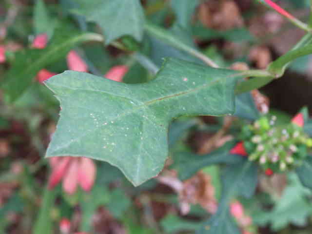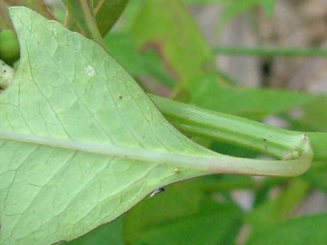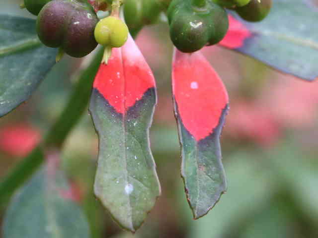 | ▼上部の葉の基部が赤く染まる。 | ||