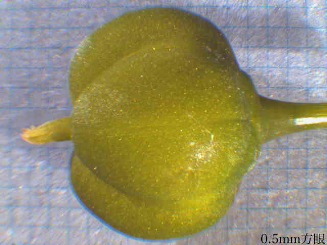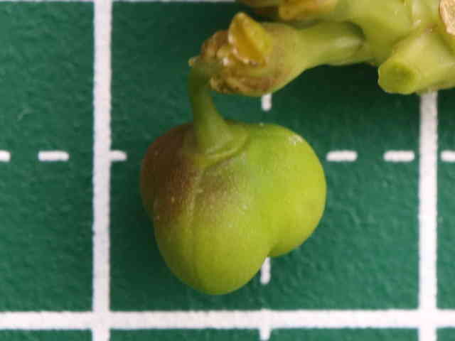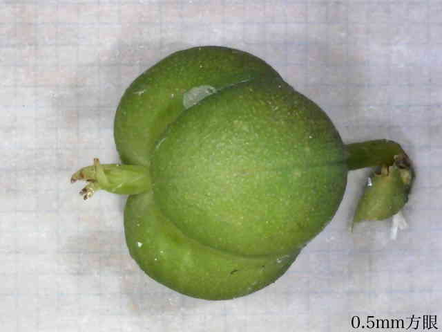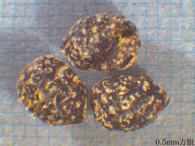 | ▼膨らみに1個ずつ種子が入る。 | ▼種子は長さ約3.5mm、こぶ状突起がある。 | ▼種子の表面に白斑がある。 |