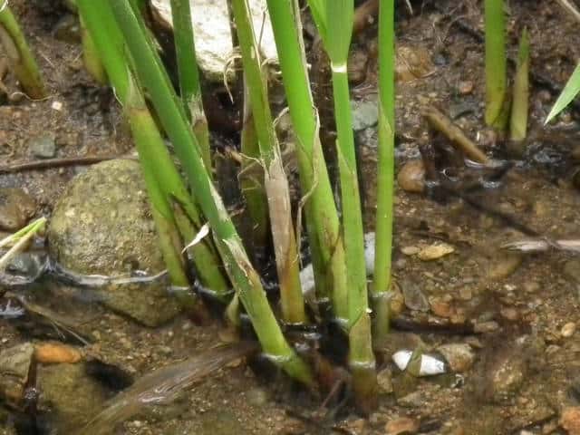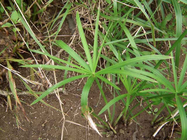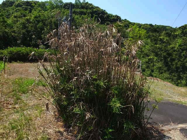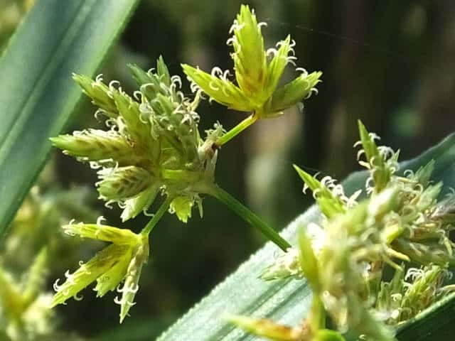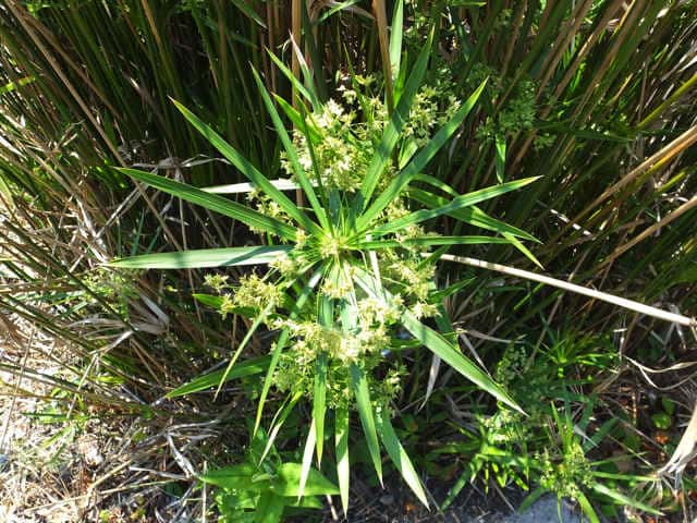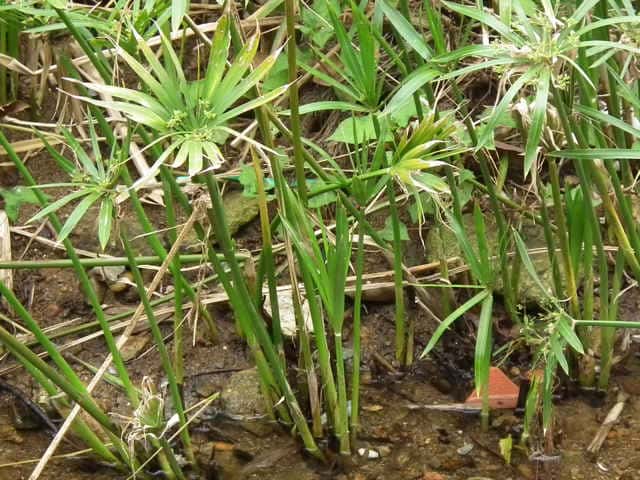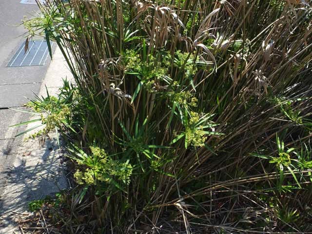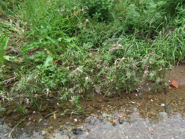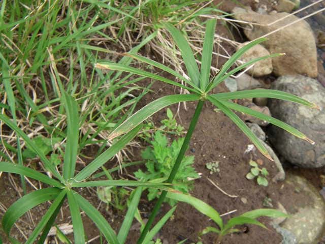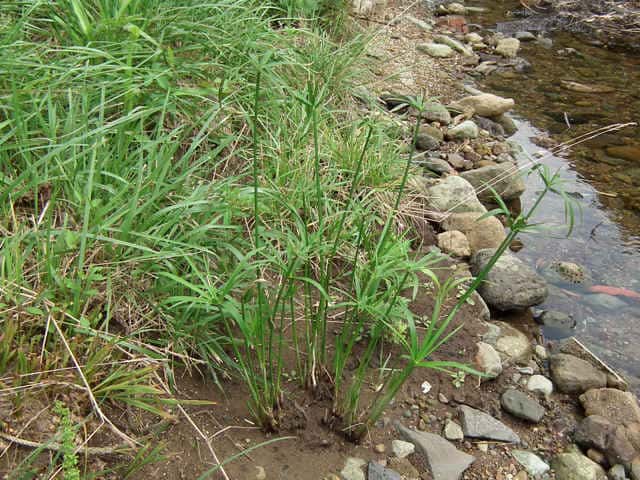 多年草 マダガスカル原産、観賞用に栽培されるが、河川の岸辺に逸出してる帰化植物。植物体は叢生し、短い根茎を持つことがある。稈は通常高さ70〜100cmだが、時に100cmを超えることがある。葉は退化し稈の基部に鞘状につく。苞葉の葉身は葉状で稈の頂端に傘状に互生し、約20枚、線状で長さ10〜20cm、先端は尖る。花序枝は2〜7cm、多数つき、苞葉の葉身と交互に並ぶ。小穂は長楕円形、長さ5〜10mm、扁平、淡褐色、花序枝の先に数個つく。鱗片は楕円形、長さ1.8〜1.9mm、短芒を持ち、竜骨はやや鋭形。そう果は倒卵形、長さ約0.8mm、横断面は3稜形。花柱はそう果とほぼ同長。柱頭は3個。花期は6〜7月。(岡山県カヤツリグサ科植物図譜) 学名は、Cyperus alternifolius カヤツリグサ科カヤツリグサ属 |