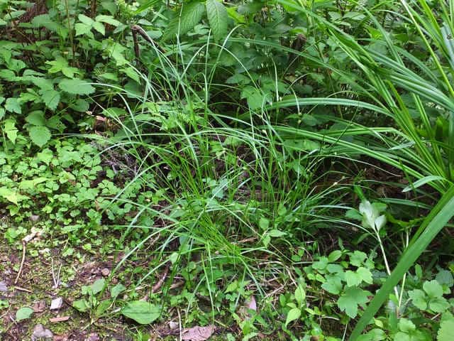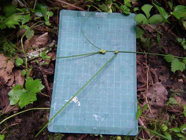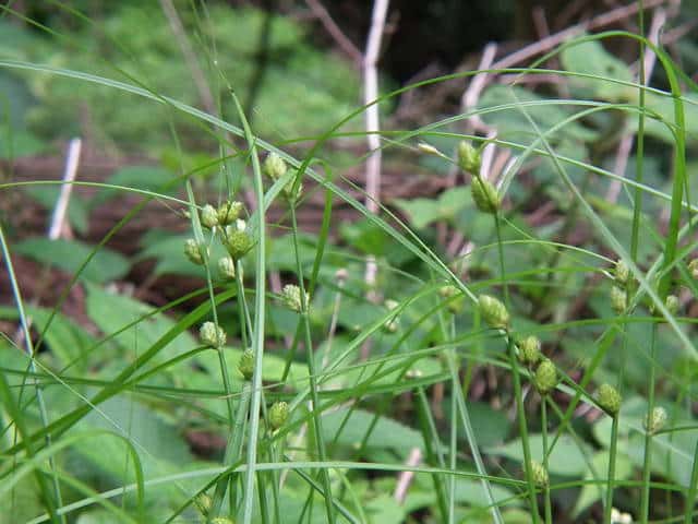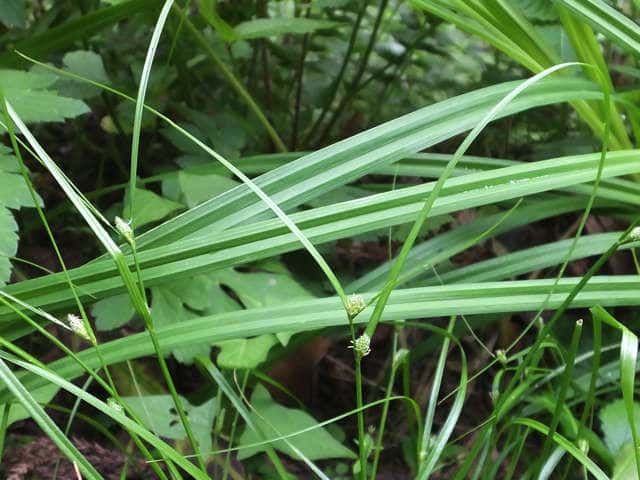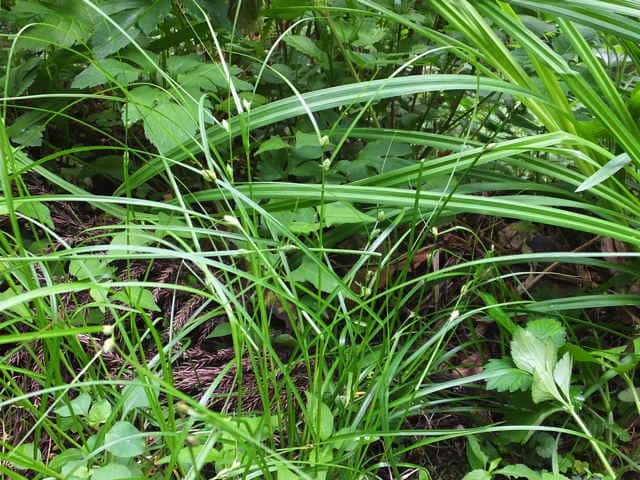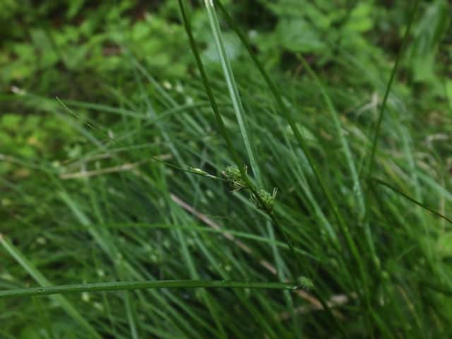 | 多年草 北海道〜九州の平地から低山地の湿った樹林内に生える。根茎は短く密に叢生する。葉は幅1.5〜2.5mm。有花茎は高さ30〜80cm、鈍稜があって平滑。花序は4〜7個の無柄の小穂をやや間を開けてつけ、苞は葉状で花序より著しく長い。小穂は雌雄性で、多数の雌花と基部に少数の雄花をつけ、卵形で長さ6〜10mm、幅4〜6mm。雌鱗片は淡緑色、果胞より短い。果胞は広卵形で扁平、広い翼があり、長さ3.5〜4.5mm。果実は長さ1.5mm。小穂の数が少ないマスクサと間違えることがあるが、本種の果胞はひと回り大きく、柱頭は2岐。果期は5〜7月。(日本のスゲ) 学名は、Carex planata カヤツリグサ科スゲ属ヤブスゲ節 |