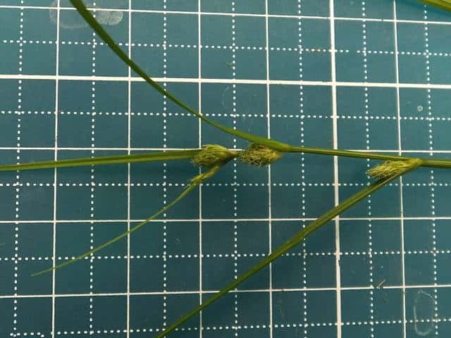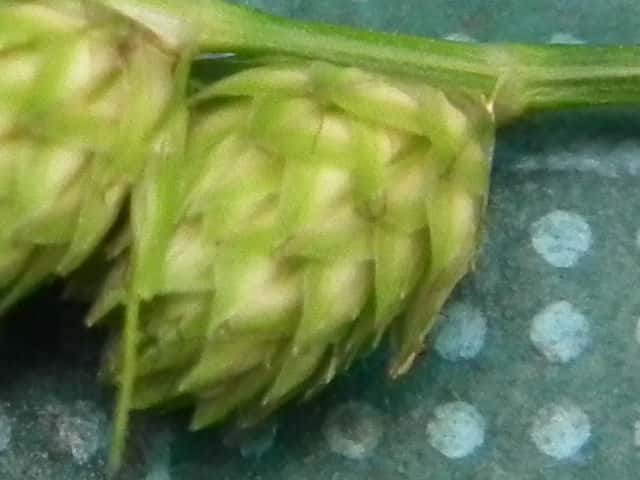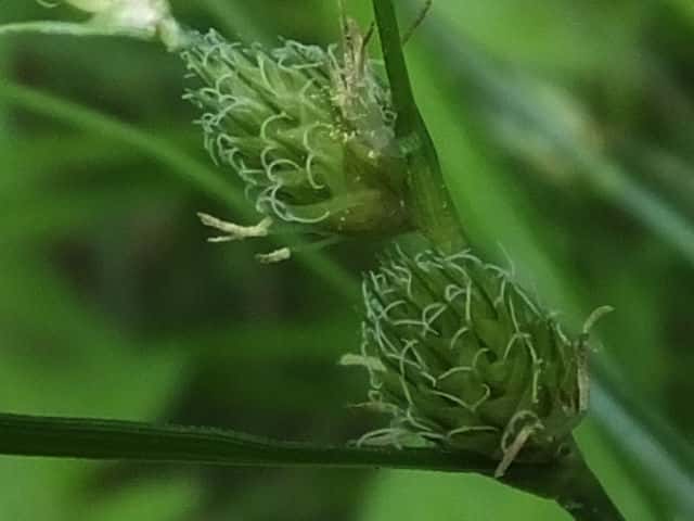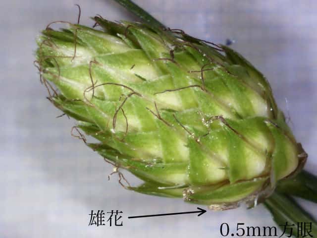 | ▼小穂の基部に雄花が見える。 | ▼雄花。 | ▼鱗片は長さ約3.5mm、果胞は4.5mm。 |