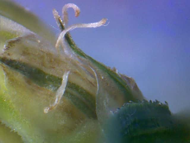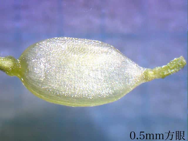 | ▼若い果実は長さ約1.7mm。 | ▼柱基はやや膨れる。 | |