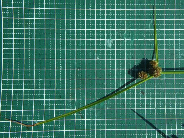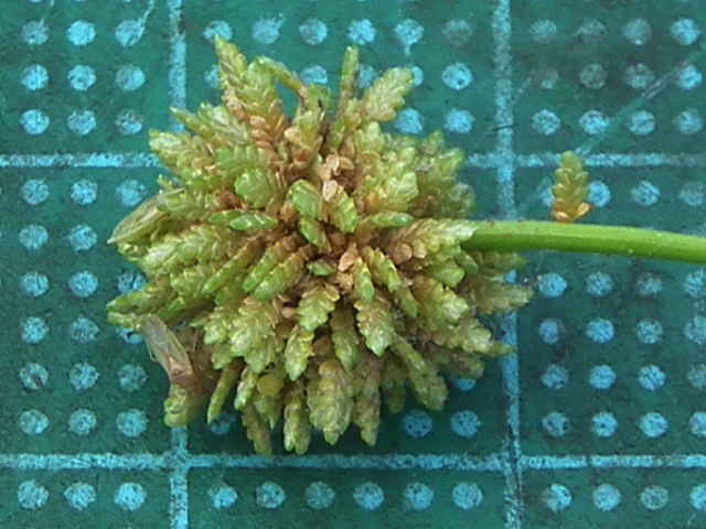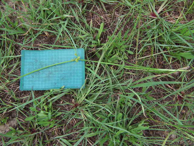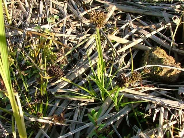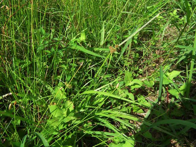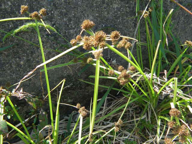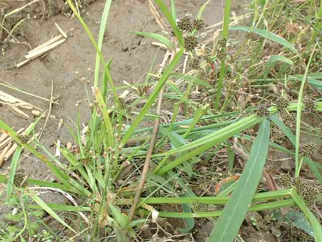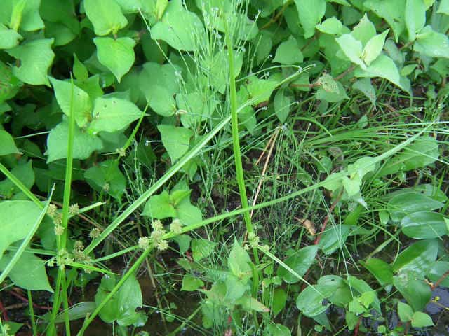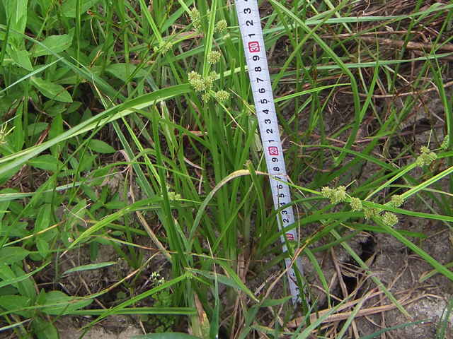 | 1年草 北海道〜九州の水田や湿地に普通。植物体は叢生し、軟らかい。稈は高さ20〜50cm、少数の葉がある。葉は幅2〜4mm、稈より短い。苞葉の葉身は2〜3枚、花序より長い。基部の鞘は赤褐色を帯びる。花序は単一または複生、通常長さが異なる数本の花序枝の先に頭状の分花序をつける。小穂は線形、長さ3〜8mm、10〜20個の花をつけ、帯暗褐色、密に球状の花穂をつくる。鱗片は広倒卵形、長さ約0.7mm、中肋は緑色でわずかに尖り、上端は少し凹む。そう果は倒卵形、長さ約0.6mm。花柱は短い。柱頭は3個。花期は8〜10月。(岡山県カヤツリグサ科植物図譜) 学名は、Cyperus difformis カヤツリグサ科カヤツリグサ属 |