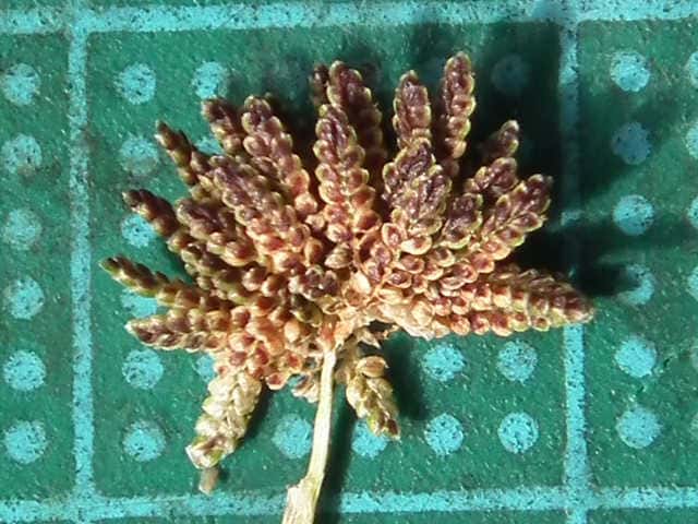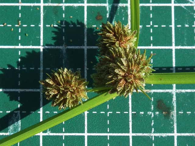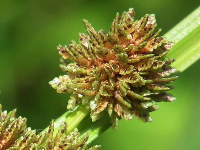 | ▼花序は直径約1cm。 | ▼花穂は長さ約4mm。 | ▼果実は3稜形、長さ約0.5mm。 |
