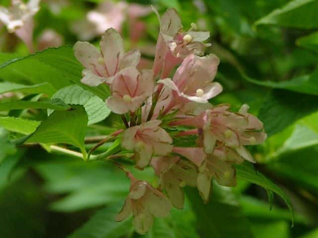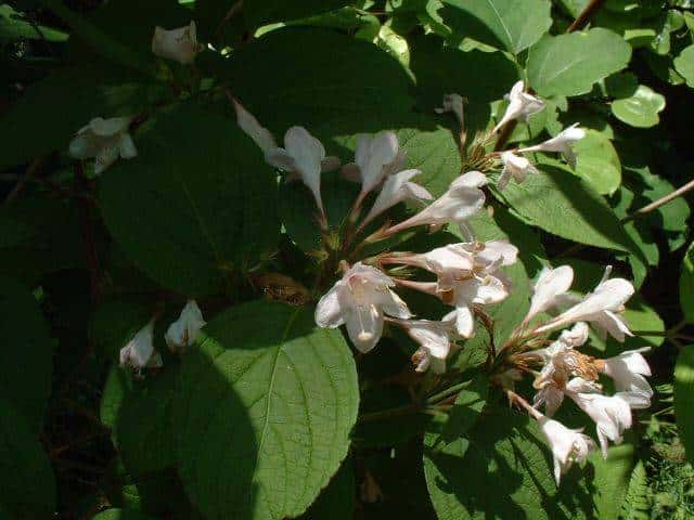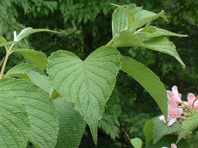 | 落葉小高木 北海道〜本州の主に日本海側の日当たりのよい山野に生える。下部からよく分枝して株立ちになり、高さ5mほどになる。樹皮は灰褐色。縦に裂けて、はがれ落ちる。本年枝は紫褐色を帯び、皮目が多い。葉は対生し、葉身は長さ4〜10cm、幅2〜6cmの楕円形〜卵状楕円形。先端は鋭くとがり、基部は円形〜広いくさび形。縁には細かい鋸歯がある。裏面は全面に白い毛があるが、とくに脈の両側に密生し、脈上には少ない。葉柄は長さ3〜10mm、有毛で赤みを帯びる。枝先や上部の葉腋に桃紅色または紅色の花を2〜3個ずつつける。花冠は長さ2.5〜3.5cmの漏斗形で、先は5裂する。花筒は下部からしだいに膨らむ。子房は長さ8〜10mmの細い円筒状で、一見すると花柄のように見える。雄しべは5個あり、花筒とほぼ同長。花柱は1個、花筒から少し突き出る。萼は有毛で基部まで5裂する。萼片は長さ4〜7mm。苞は長さ2〜6mmの披針形〜線形で、1対ある。果実はさく果で、長さ1.2〜1.8cm、直径2.5〜3mmの円柱形で、かたい。10月頃熟すと先端が2裂して、長さ1mmほどの楕円形の種子を多数だす。種子の周囲には翼がある。花期は5〜6月。 冬芽は、卵形。芽鱗は褐色で7〜8対。葉痕は腎臓形〜三日月形。維管束痕は3個。 学名は、Weigela hortensis スイカズラ科タニウツギ属 |