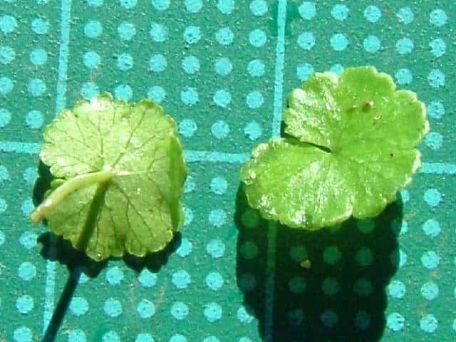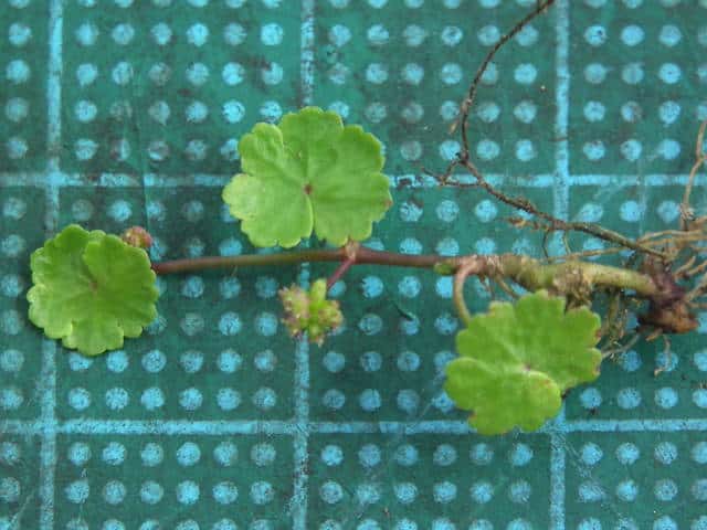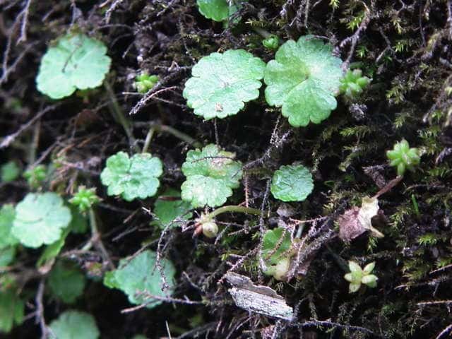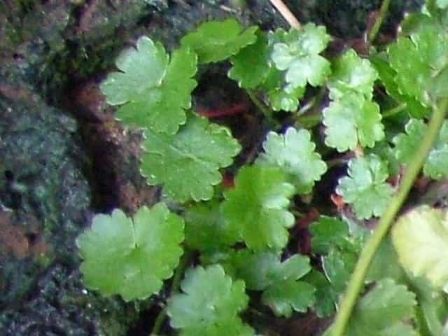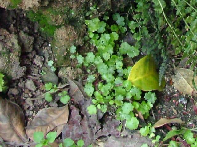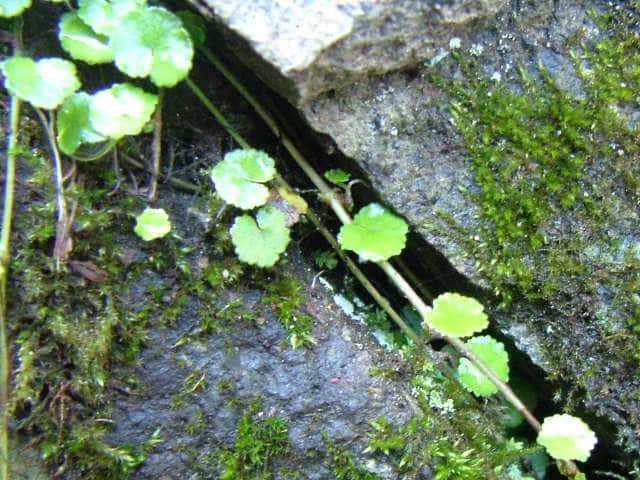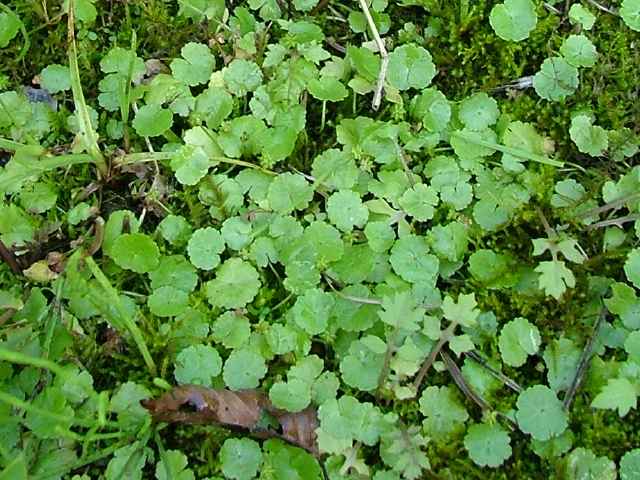| 多年草 本州〜沖縄の道ばたや庭の芝生になどに生える。茎はよく分枝して地をはい、節からひげ根をだしてふえる。葉は直径1〜1.5cmの円形で掌状に浅く裂け、基部は心形。ふちには3〜5個の歯牙がある。表面は光沢があり、関東地方以西では冬も枯れずに越冬する。葉腋から長さ0.5〜1.2cmの葉より短い花柄をだし、帯緑色の小さな花が10数個かたまってつく。果実は直径約1mmの扁球形。花期は6〜10月。(野に咲く花) 学名は、Hydrocotyle sibthorpioides ウコギ科チドメグサ属 チドメグサの仲間 |