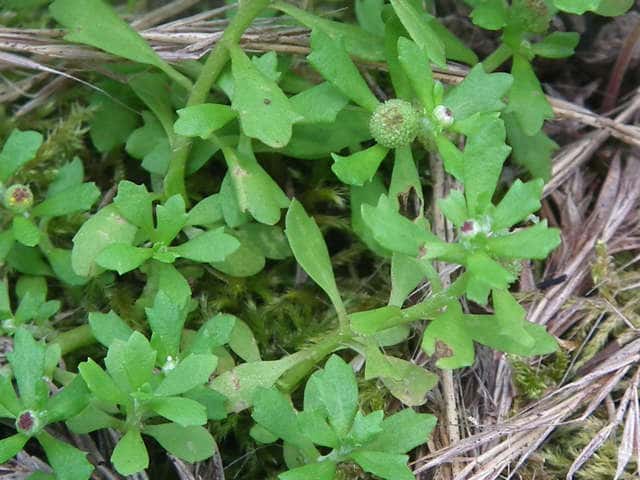 | 1年草。 日本全土の庭や道ばた、畑などにごくふつうに見られる。茎は細くて枝分かれし、地をはって長さ5〜20cmになり、ところどころに根を出す。葉は互生し、長さ1〜2cm、幅3〜6mmのくさび形で、先端に3〜5個の鋸歯がある。葉腋に小さな球形の頭花をつける。頭花は直径3〜4mmで、筒状花だけからなる。中心部に両性花が10個ぐらいつき、まわりに雌花が多数つく。両性花の花冠は褐紫色を帯び、先は4裂する。雌花の花冠はごく小さいく、緑色の子房の方が目立つ。両性花も雌花も結実する。花期は7〜10月。(野に咲く花) 学名は、Centipeda minima キク科トキンソウ属 |