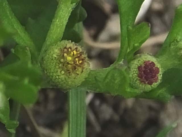 | ▼中央に両性花が数個、周りに雌花が多数ある。 | ▼集合果は直径約4mm。 | |