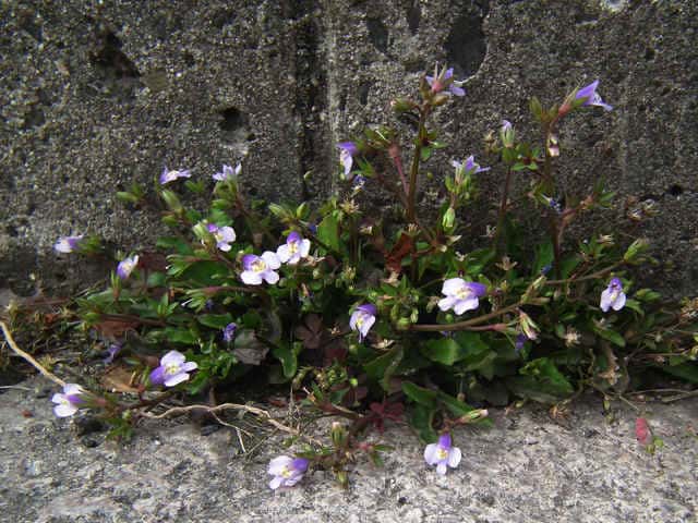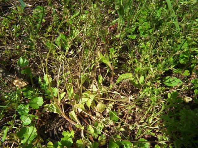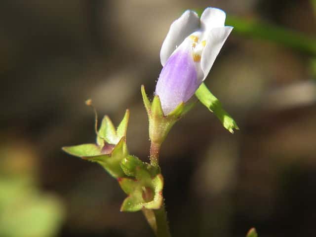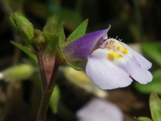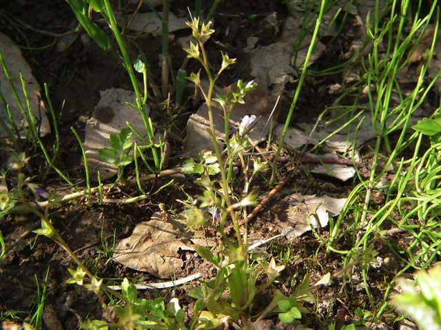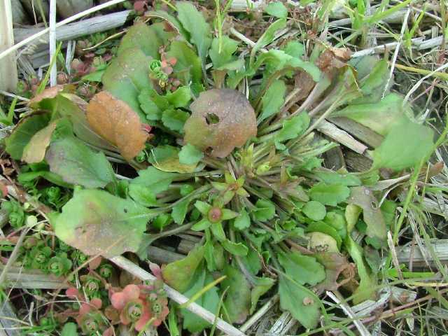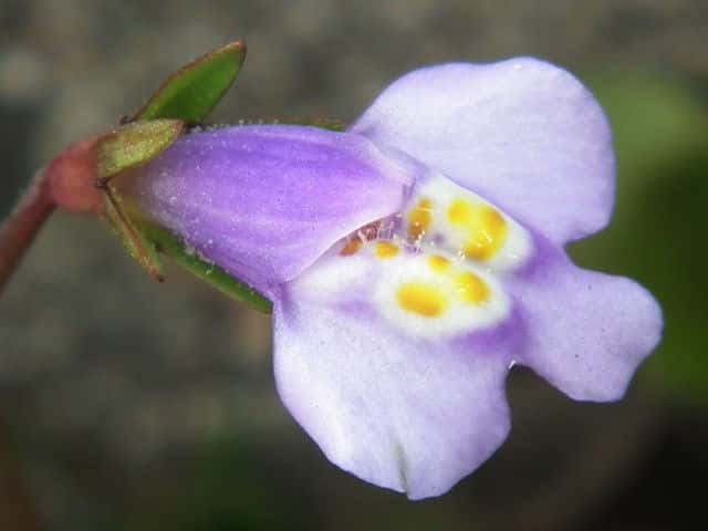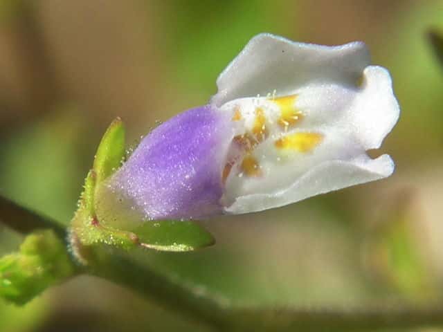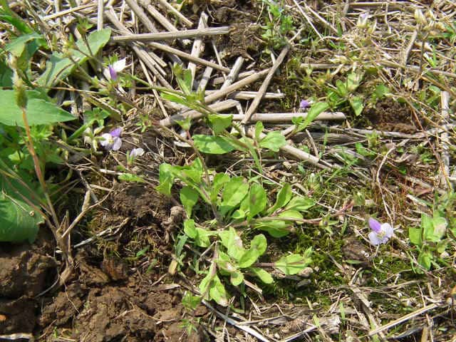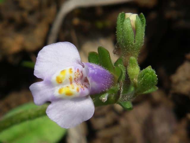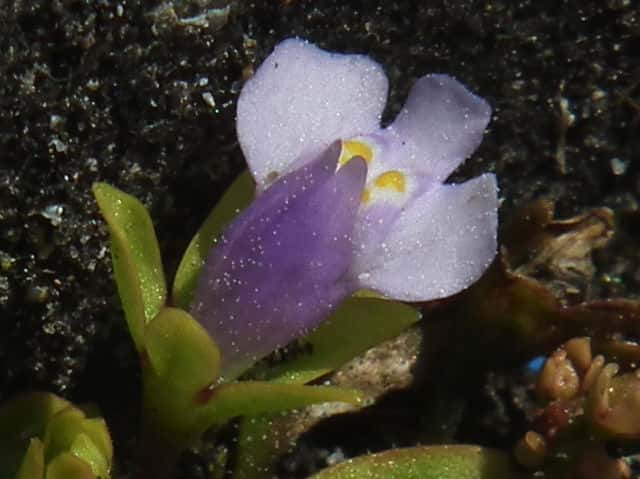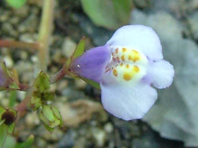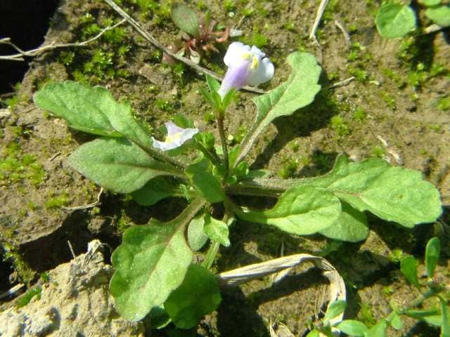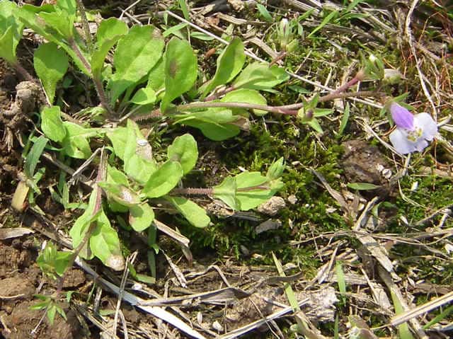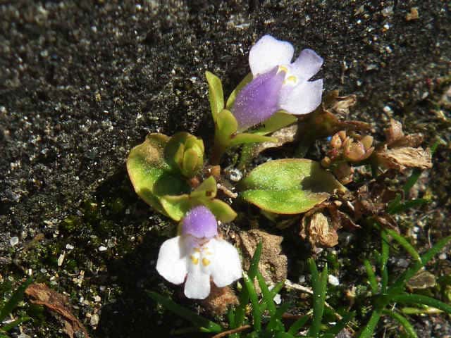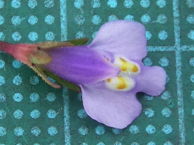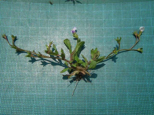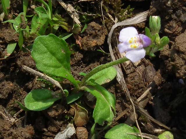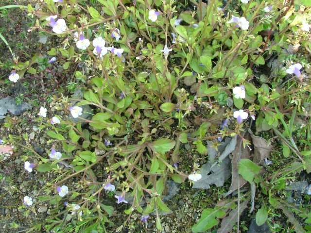 | 1年草 日本全土の路傍や畑にふつうに見られる。茎は根ぎわに集まる葉の間から伸び、直立して少数の枝を出し、高さ5〜25cmになる。葉は根ぎわのものは大きくて対生し、上部では小さくなって互生する。葉身は倒卵形で先は鈍く浅い鋸歯があり、長さ1〜3cm、幅0.5〜1.5cm。茎の先に総状花序をつくり、まばらに花をつける。萼は鐘形、半ばまで5裂し、裂片は長楕円状披針形。花冠は淡紅紫色で長さ約1cm、上唇は下唇の約半分で卵形、先はわずかに2裂。下唇は3裂、中央部は黄色で隆起し赤褐色の斑紋がある。さく果は扁球形で萼に包まれる。花期は4〜10月。(日本の野生植物) 学名は、Mazus pumilus サギゴケ科サギゴケ属 似た花のサギゴケは、花が大きく横にはう枝を出して増える。 |