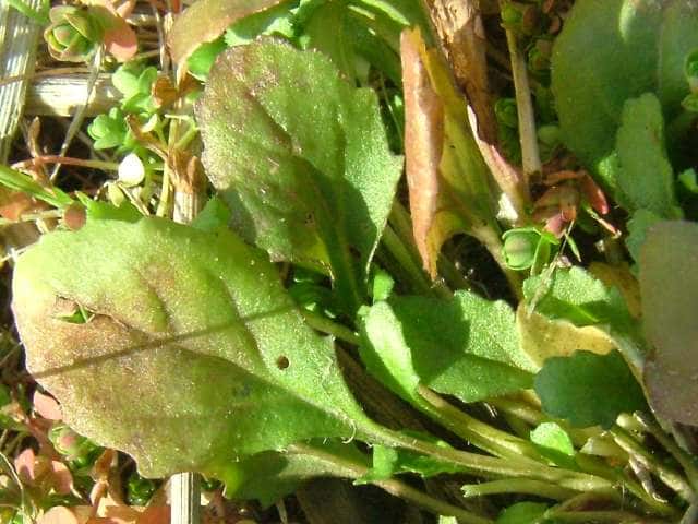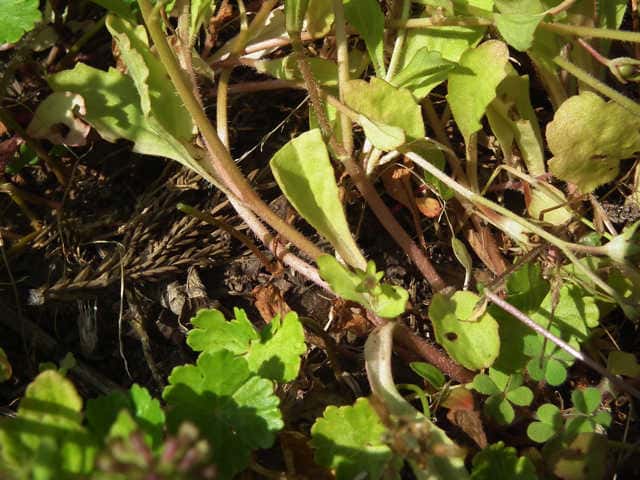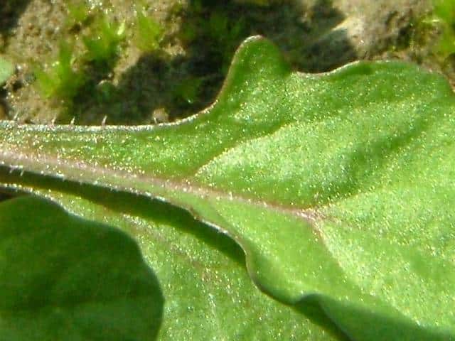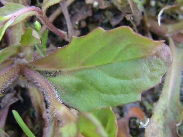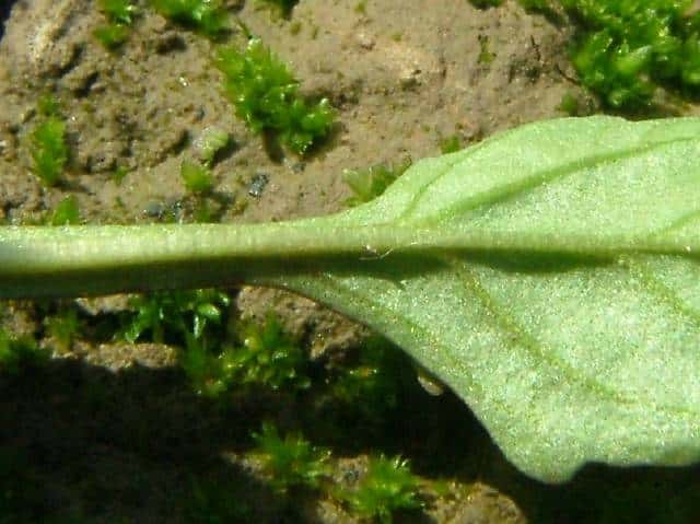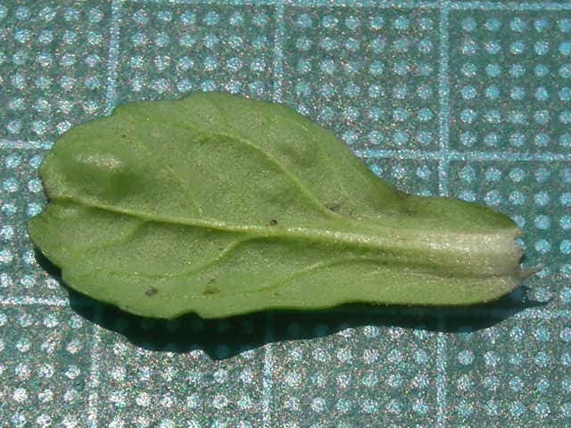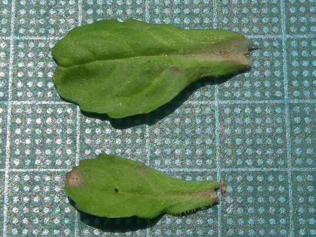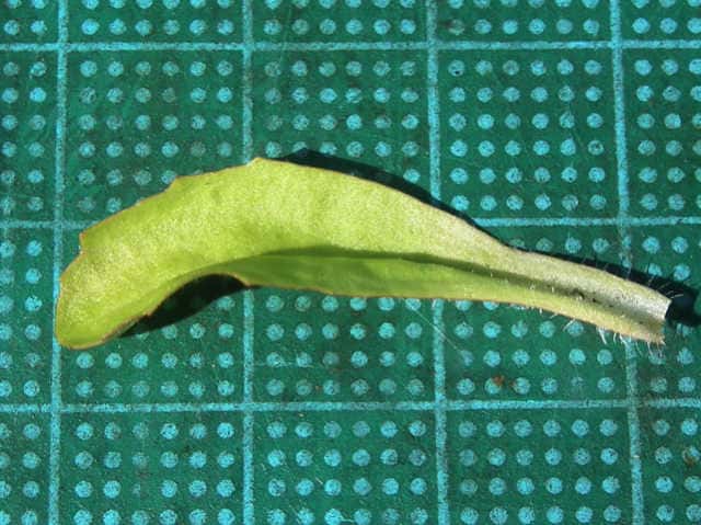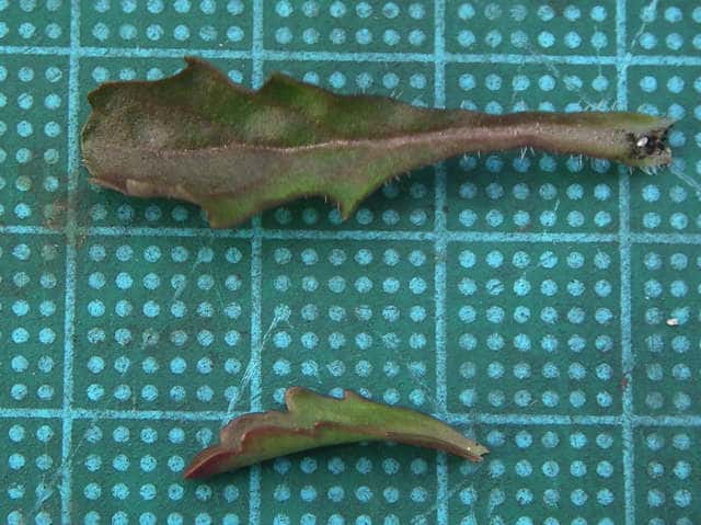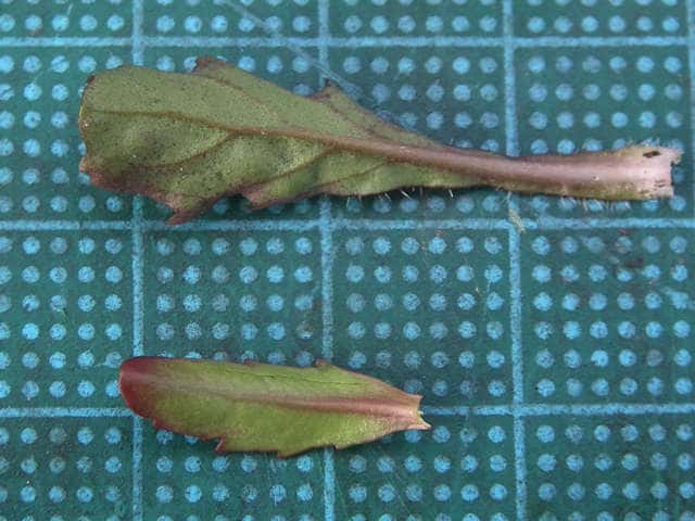 | ▼根生葉(上)は長さ約3cm、茎葉(下)は長さ約1.5cm。 | ||