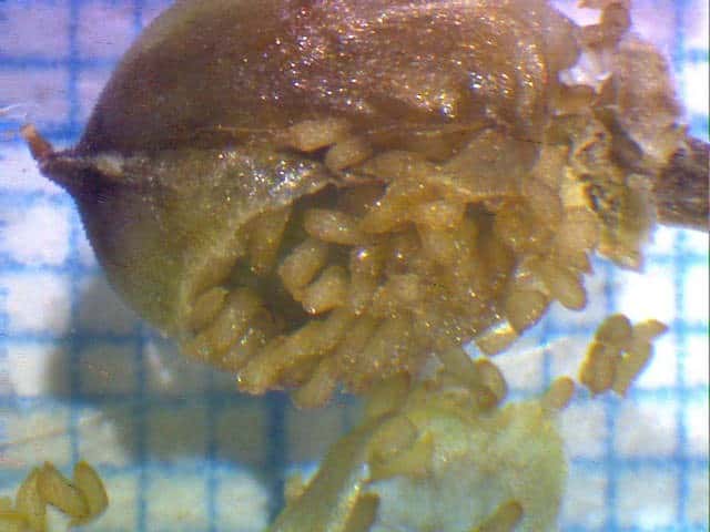 | ▼熟すと裂けて種子が出る。 | ▼果実には種子が多数入る。 | |