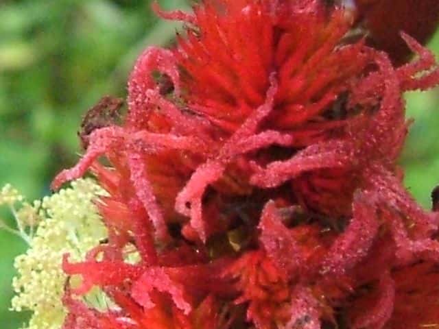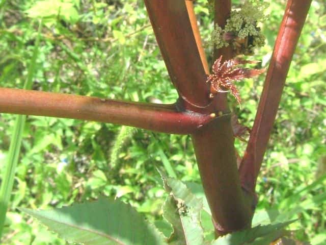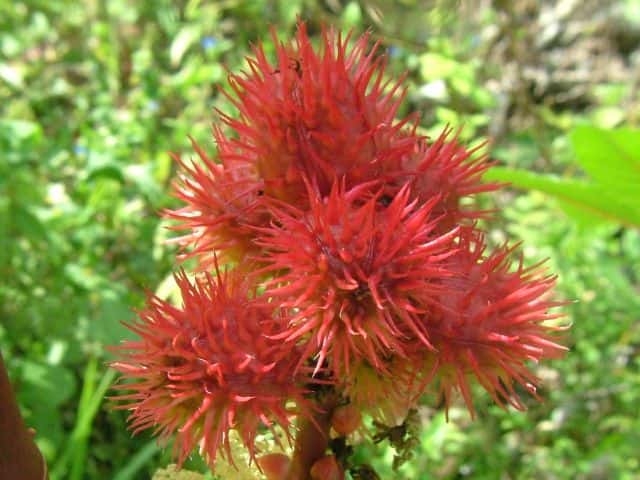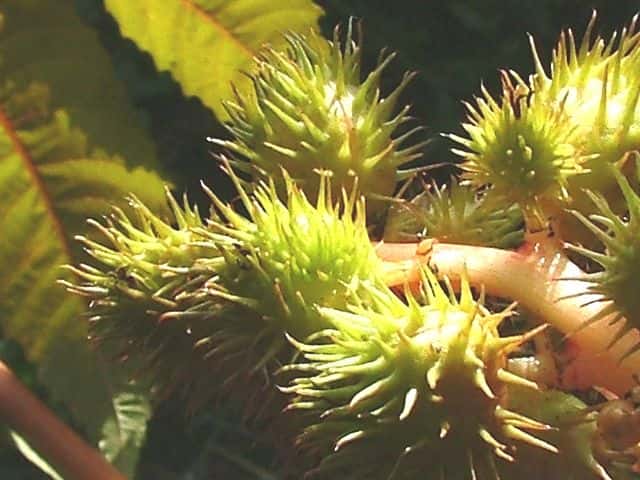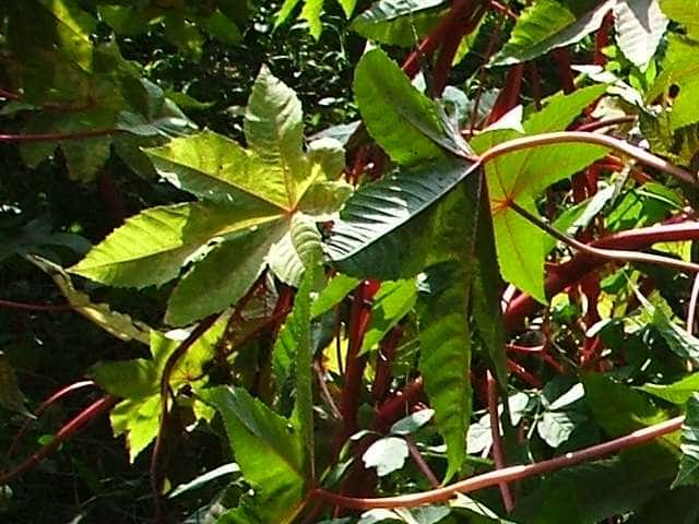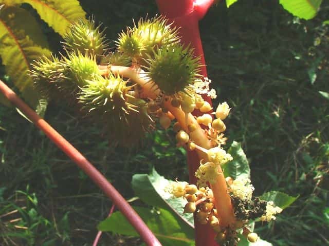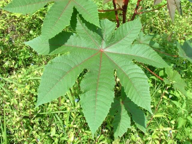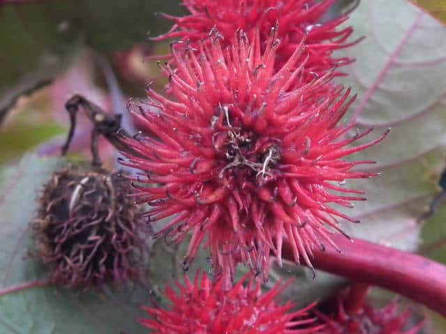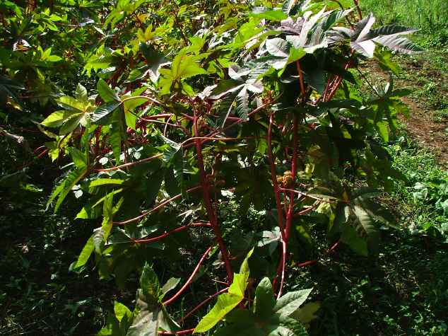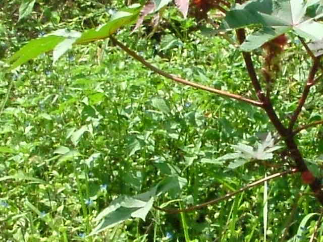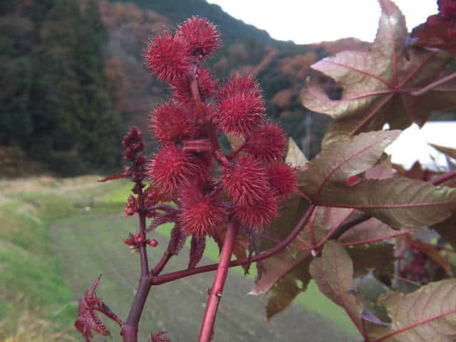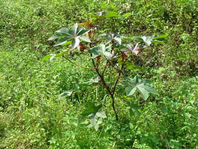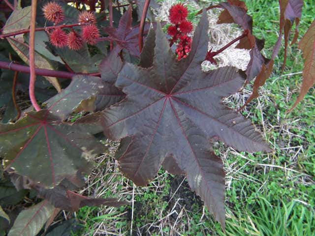 | 1年草 アフリカ北東部原産。中国から平安時代初期に、アメリカから江戸時代末期に導入された。西日本を中心に逸出し、野生化している。全体無毛で通常暗紫色を帯びる。茎は円柱形で直立し、まばらに分岐して高さ2mに達する。葉は大型で掌状に5〜11に裂け、縁に鋸歯があり、長い柄で互生する。茎の頂と葉腋に長さ20cmほどの花序を付け、雌花を上部に、雄花を下部につける。さく果には通常刺があり、中に長さ13mmほどで光沢のある3種子を含む。花期は秋。(日本帰化植物写真図鑑) 学名は、Ricinus communis トウダイグサ科トウゴマ属 |