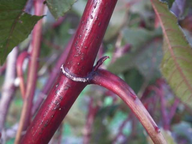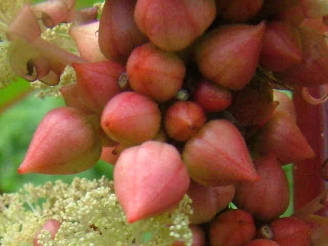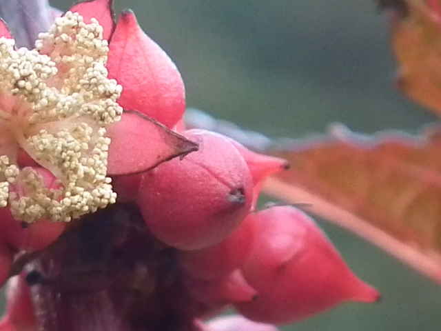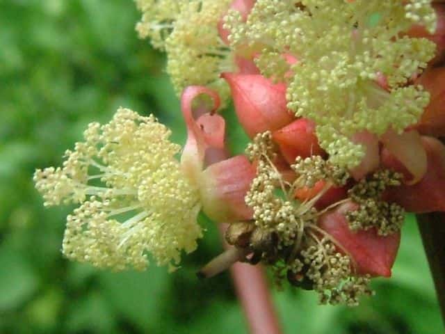 | ▼蕾。 | ▼葉は掌状に裂け、葉柄が楯状につく。 | |
