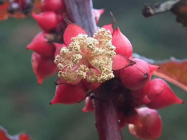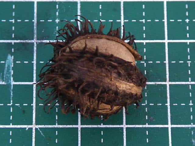 | ▼2013年11月30日 果実 植裁 八雲 | ▼若い果実、長い刺が密生する。 | ▼熟した果実は3裂する。 |