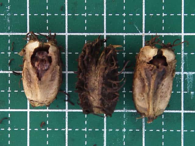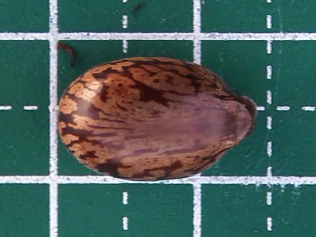 | ▼種子は裂片に1個ずつ入る。 | ▼種子は長さ約1.4cm、斑点がある。 | |