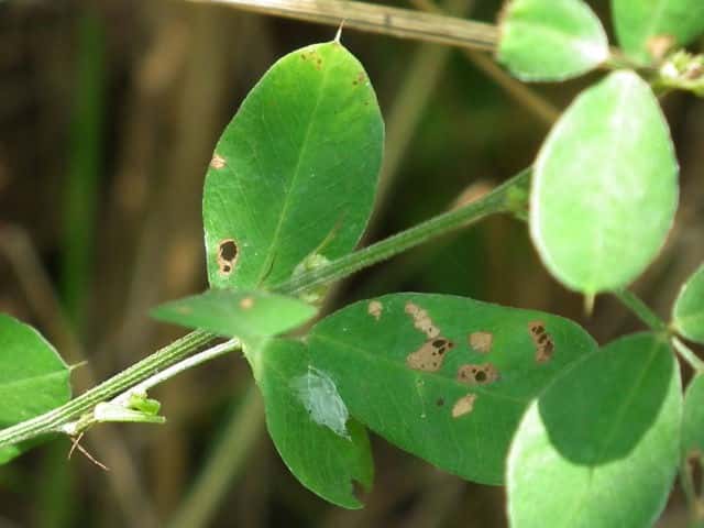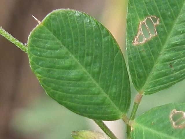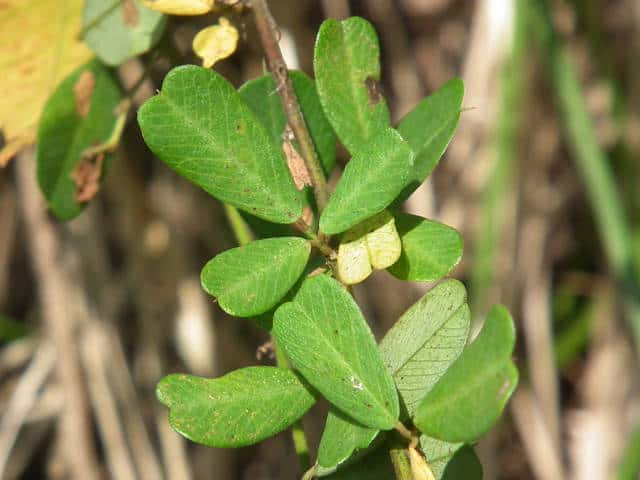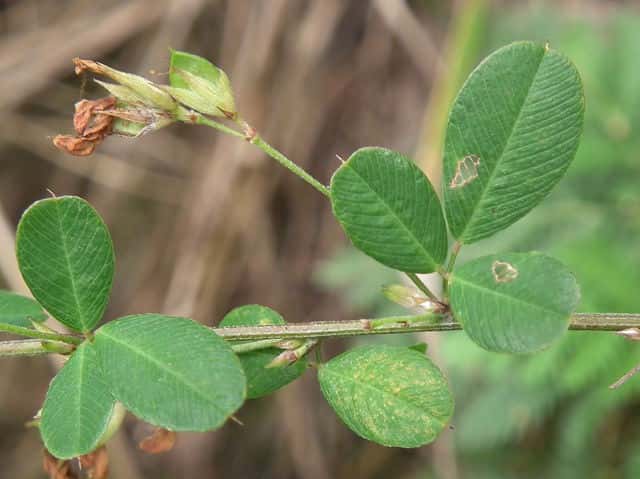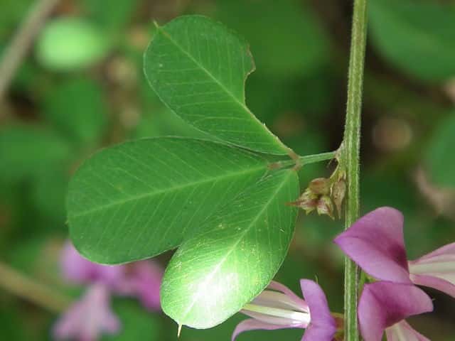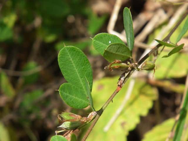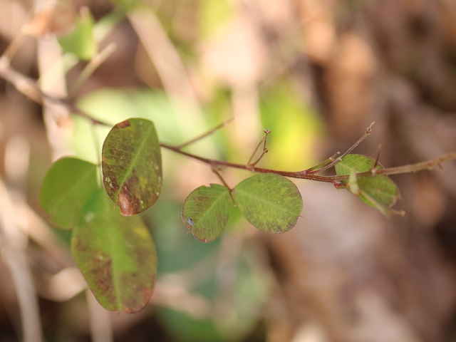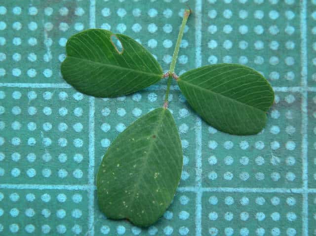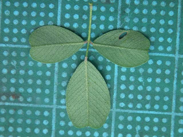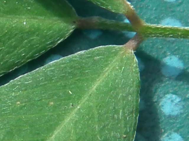 | ▼花序枝は短い | ▼小葉は長さ1.5cm、倒卵形。 | ▼小葉の先は少し凹み、鈍角〜円頭、切形。 |