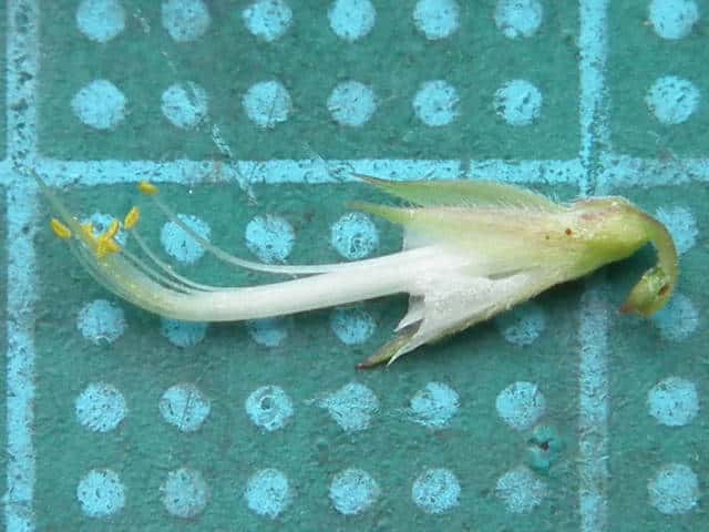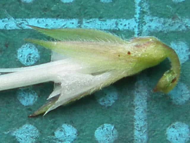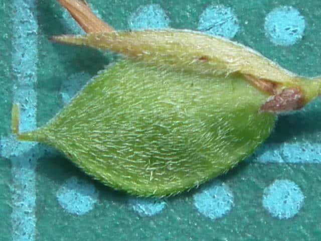 | ▼萼は長さ約6mm、毛が多く先は尖る。 | ▼若い果実は長さ約5.5mm、毛が多い。 | |