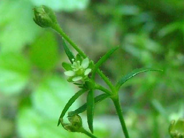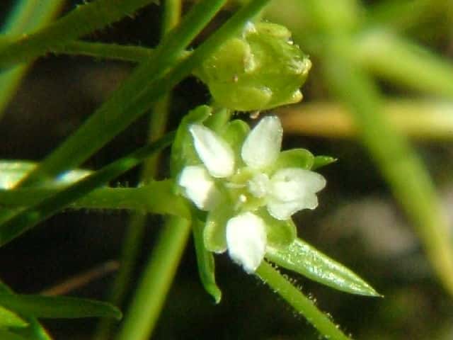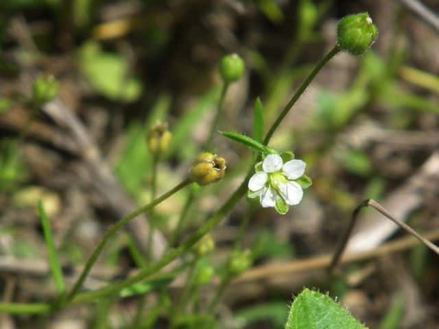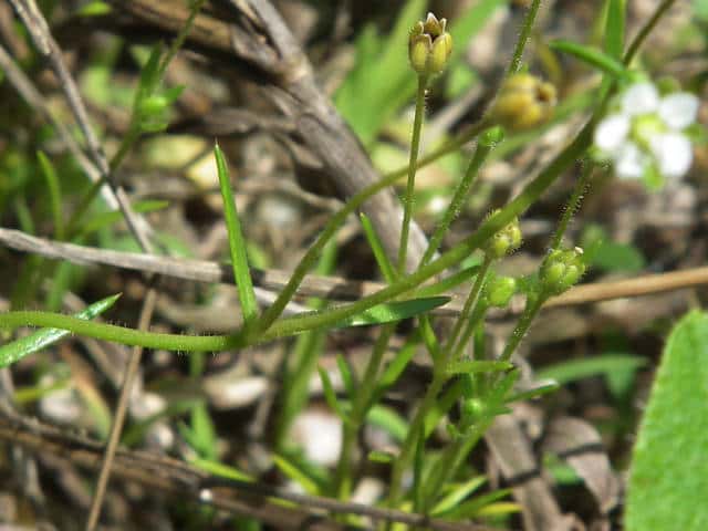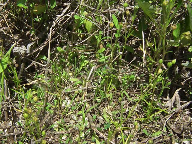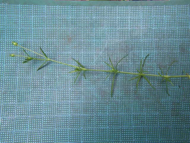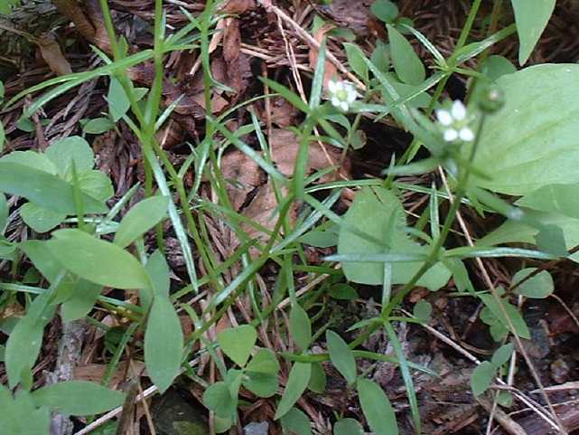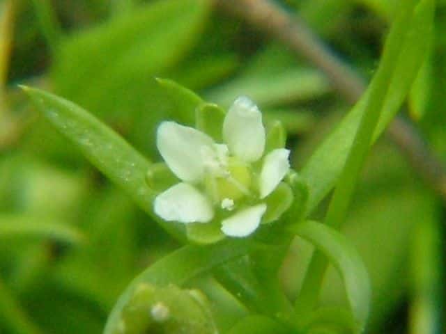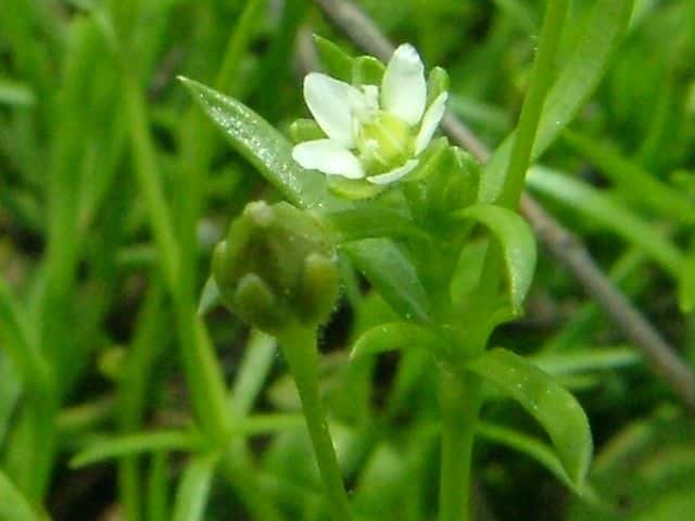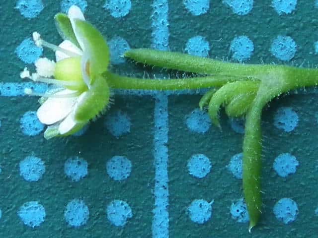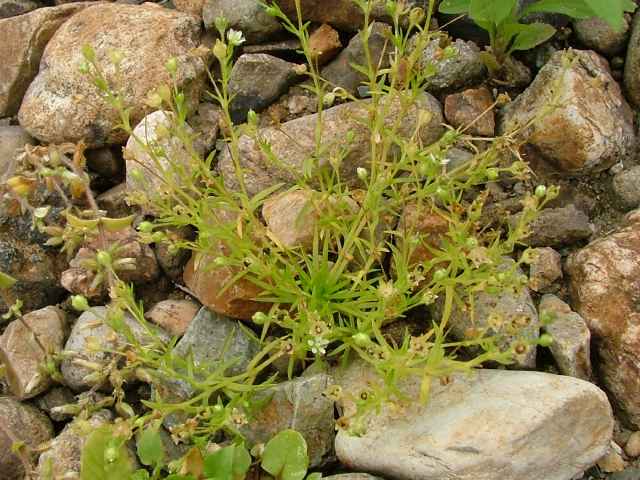 | 1〜越年草 日本全土の庭や路傍でふつうに見かけ、高さ2〜20cm。茎は斜上し、下部からよく分枝して株状になり、上部に短い腺毛がある。葉は針形、深緑色、長さ5〜20mm、幅0.8〜1.5mm、微突端、無柄。花は径約4mm、白色、上部の葉腋に単生する。花柄は長さ8〜27mm、斜上あるいは直立し、腺毛がある。萼片は5個まれに4個または6個、楕円形〜卵形、長さ2〜2.5mm、鈍頭、背面に腺毛がある。花弁は5個まれに4個または花弁を欠き、卵形〜楕円形、萼より短いか同長、雄蕊は(2〜)5〜8(〜10)個、葯は黄白色。花柱は5個。さく果は球形〜卵形、長さ約3mm、萼の1から1.5倍長、5裂または4裂する。種子は暗褐色、腎円形〜球形、長さ04〜0.5mm、表面に円柱状の突起がある。花期は3〜7月。(日本の野生植物) 学名は、Sagina japonica ナデシコ科ツメクサ属 似た花にハマツメクサがあるが、種子の突起が目立たず、イトツメクサは通常花弁がなく茎が細い。 また海岸岩場にも、種子に突起があるツメクサが生えている。 キヌイトツメクサ 白色5弁花、果実が萼から突出、種子は0.2〜0.3mm、ツメクサ様突起 |