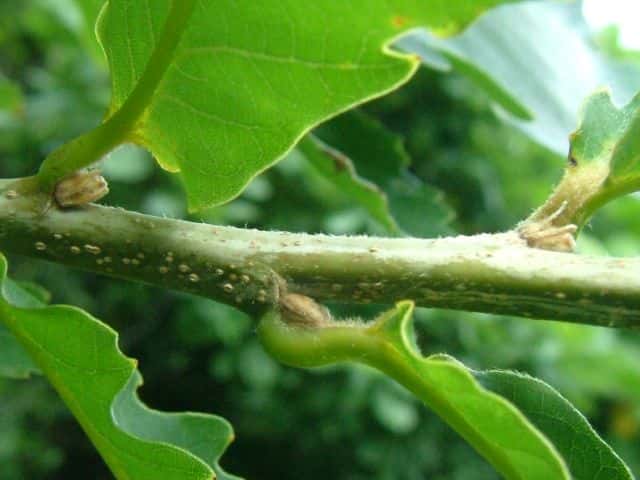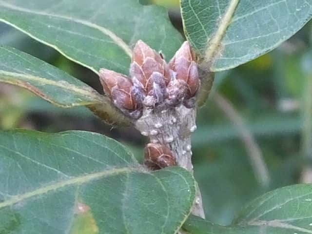 | ▼冬芽。 | ▼枝は無毛で、丸い皮目がある。 | |