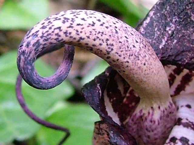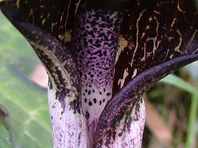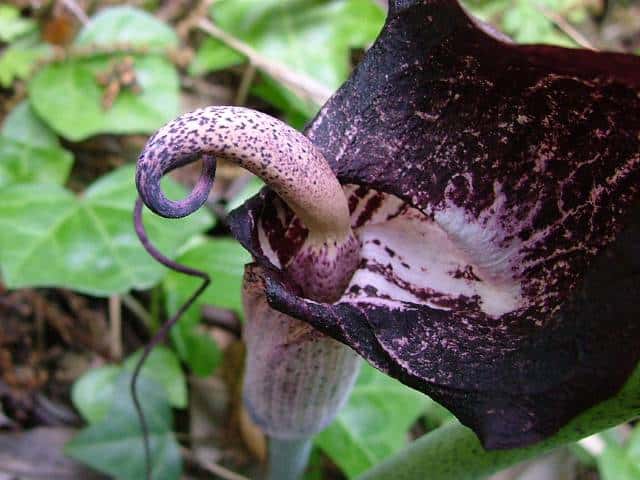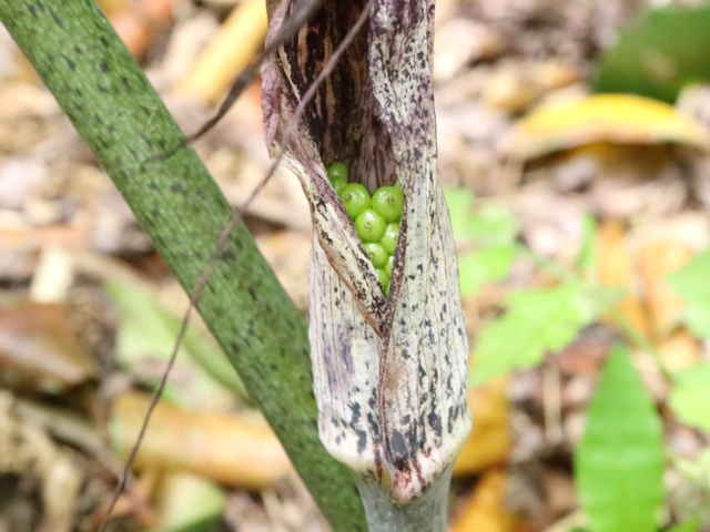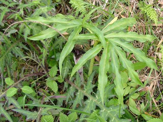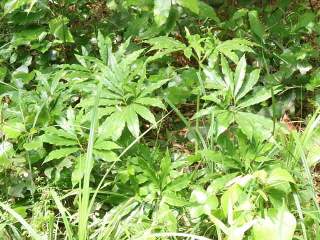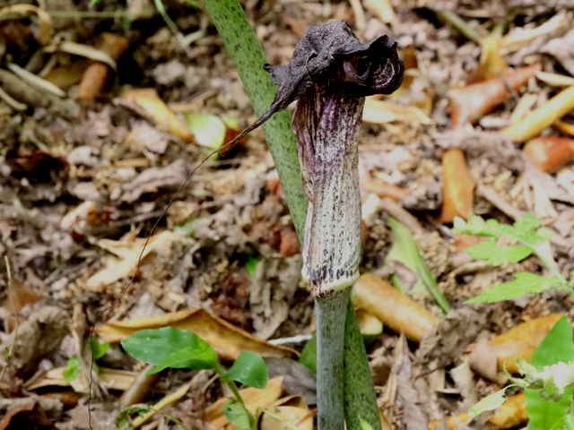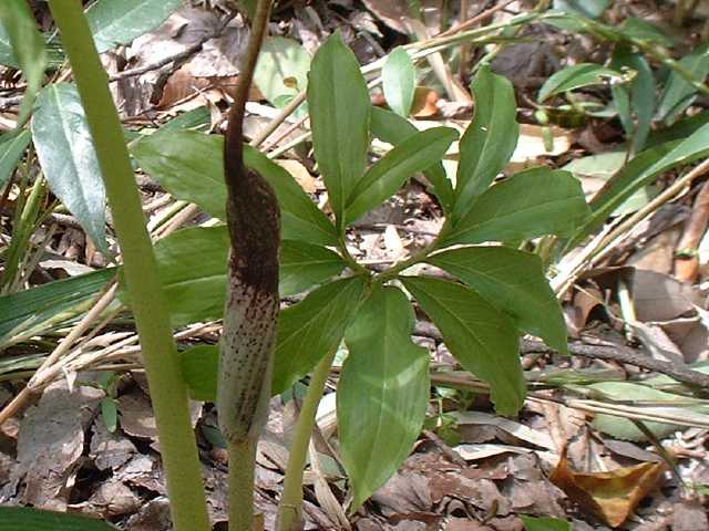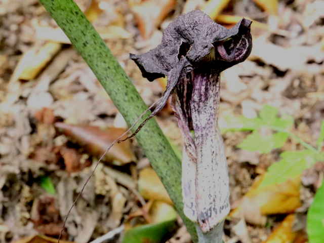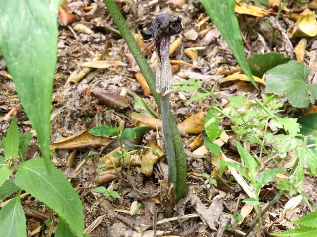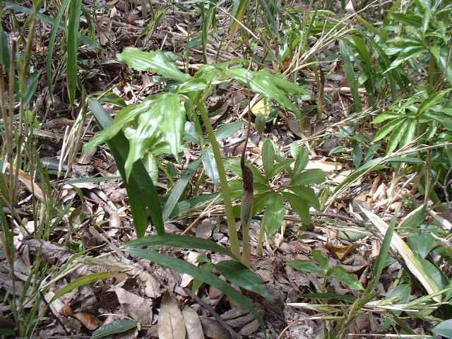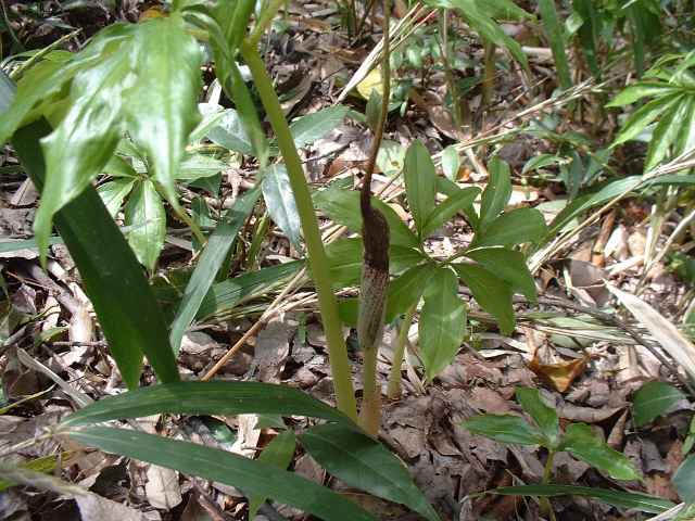 | 多年草 北海道南部〜九州の山野の木陰に生える。地中の球茎は多数の子球をつくり、盛んに栄養繁殖をするので、かたまって生えることが多い。葉はふつう1個根生し、11〜17個の小葉からなる鳥足状複葉。葉柄は高さ40〜50cmで、太くて茎のようにみえる。葉柄の基部から花茎をだし、葉の陰に紫褐色の仏炎苞に包まれた肉穂花序に花をつける。雌雄異株。若い株は雄花、肥大した球茎をもつ大きな株になると雌花をつける。花序の先の付属体は紫黒色で、長さ60cmもある。花期は3〜5月。(野に咲く花) テンナンショウ属では個体の栄養状態によって花序の性が決まることが知られており、小型株では雄花序をつけ、同一株が大型になると雌性または両性の花序をつけるようになる。(日本の野生植物) 学名は、Arisaema thunbergii subsp. urashima サトイモ科テンナンショウ属 似たものにナンゴクウラシマソウがあり、付属体の基部が白く太く小じわが密生し、中国地方や四国、九州に分布。 |