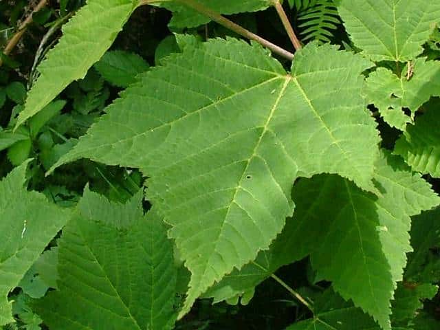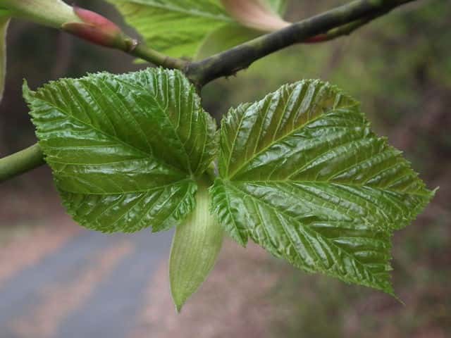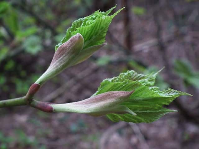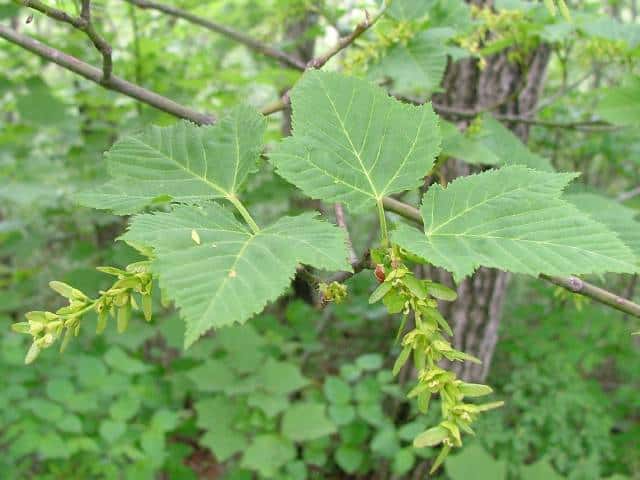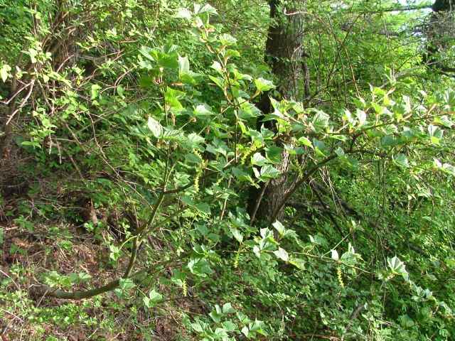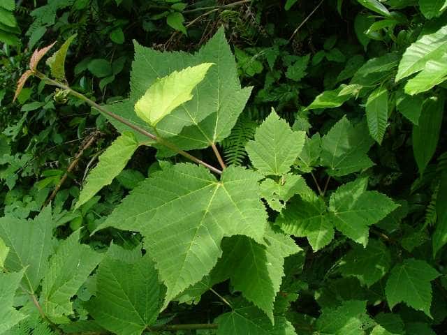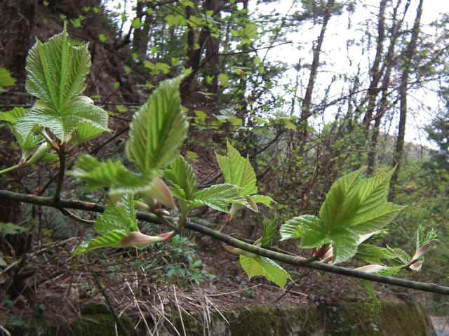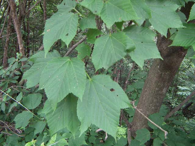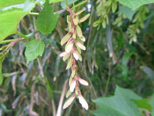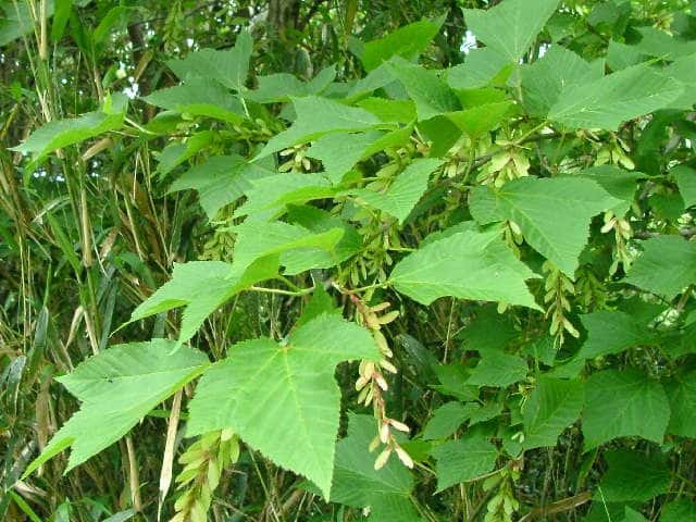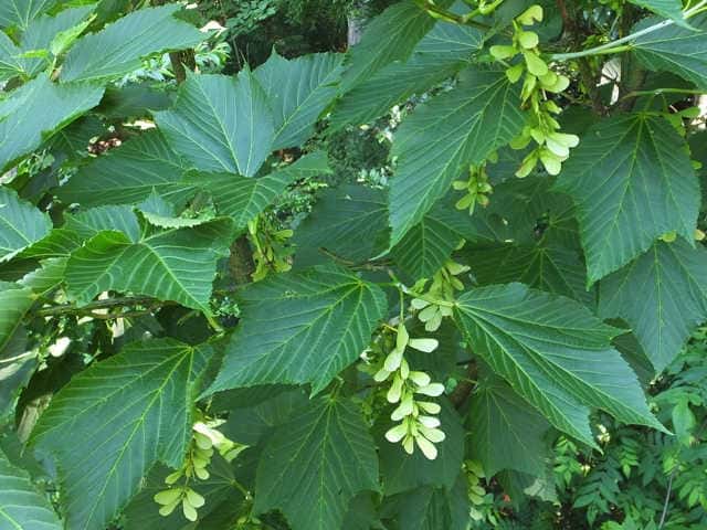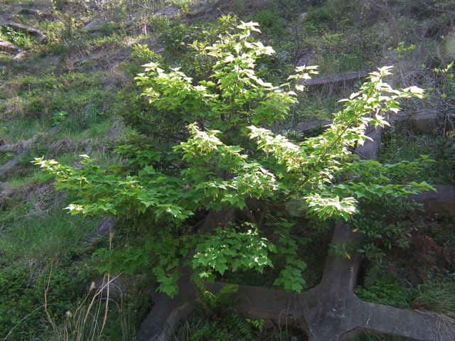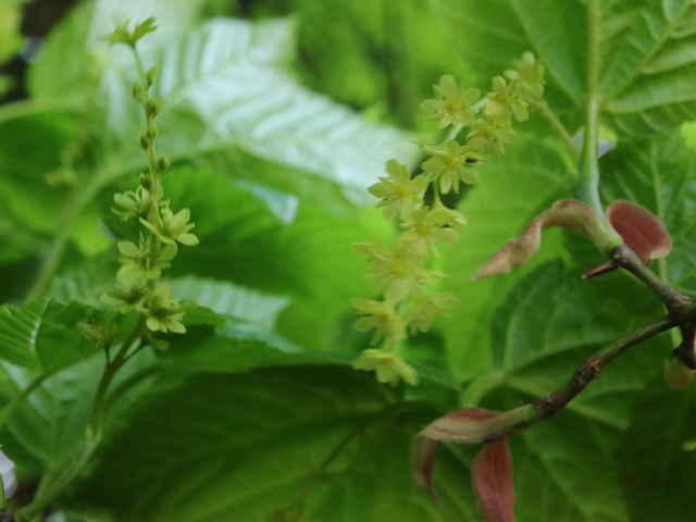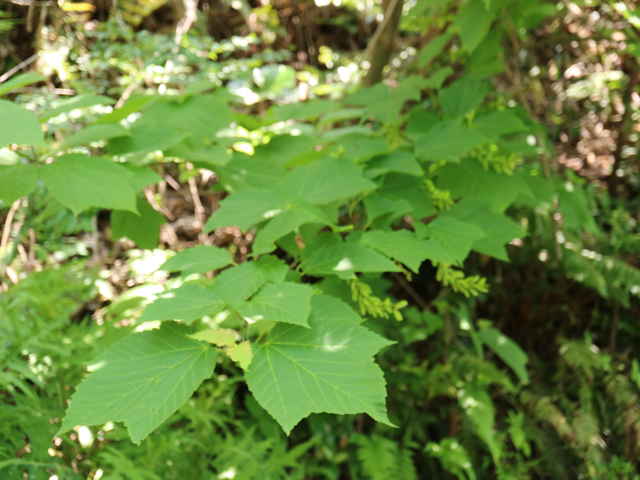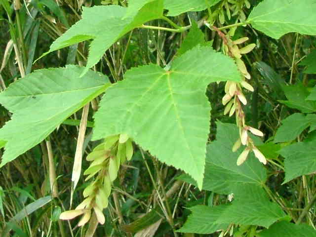 | 落葉高木 本州〜九州の山地のやや湿気のある谷間や緩やかな斜面に生え、疎林内に多い。関東地方では標高300〜1500mに生育し、まれに2000m付近でも見られる。幹は直立し高さ8〜10m、直径25〜30cmになる。まれに高さ20m、直径70cmに達するものもある。若木は暗緑色に黒い縦縞が入り、菱形状の皮目が点在する。老木の樹皮は灰褐色で縦に浅く裂ける。枝は緑色で無毛。葉は対生。葉身は長さ10〜15cmの扇状五角形で浅く3〜5裂する。裂片の先は鋭くとがり、縁には重鋸歯がある。中央の裂片は広三角形で大きい。質はやや厚く、裏面の脈上と脈腋に赤褐色の毛がある。葉柄は緑色で長さ2〜6cm、花時には赤褐色の毛がある。雌雄別株。まれに同株。淡緑色〜淡黄色の花を総状花序に10〜15個つける。花序は長さ5〜10cmで褐色の軟毛がある。花は直径8〜10mm。雄花は雌花より大きい。花弁は5個。へら形。雄花の雄しべは8個。雌花の子房には赤褐色の縮毛があり、花柱はくるっとまるまる。花柄は長さ2〜5mm。果実は翼果。分果は長さ2.5〜3cmで、赤褐色の縮毛がある。翼はほぼ直角に開き、種子の部分が丸く膨らむ。7〜10月に熟す。花期は5月頃。 冬芽は、枝先に頂生側芽を伴った頂芽がつく。側芽は対生する。芽鱗は2対、紅色または紫紅色。頂芽は長さ7〜13mmの長卵形。葉痕はV字形又はU字形、維管束痕は3個。(樹に咲く花) 学名は、Acer rufinerve ムクロジ科カエデ属 |