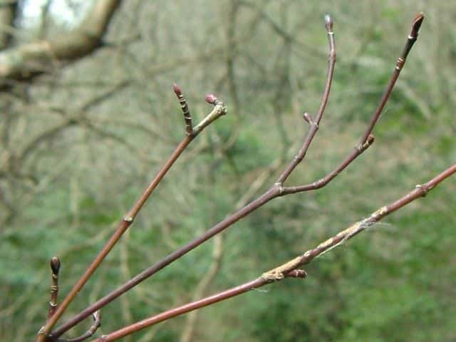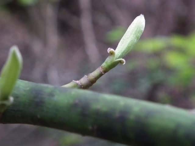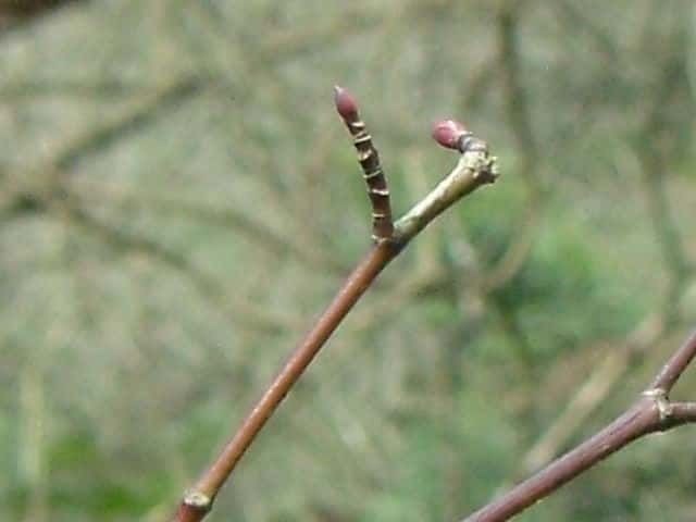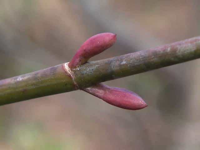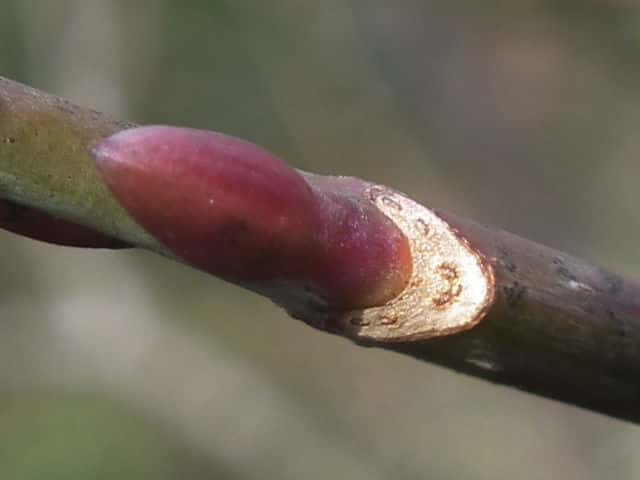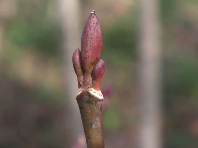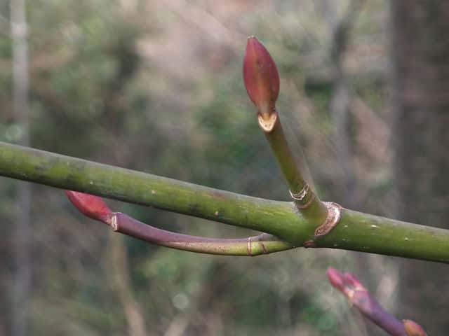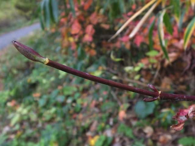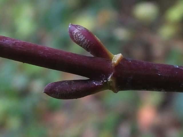 | ▼2013年2月14日 頂芽と頂生側芽 島根 | ▼側芽 冬芽には柄がある。 | ▼葉痕はU字形、維管束痕は3個。 |