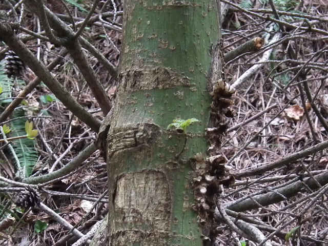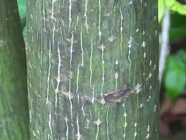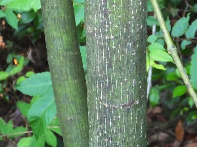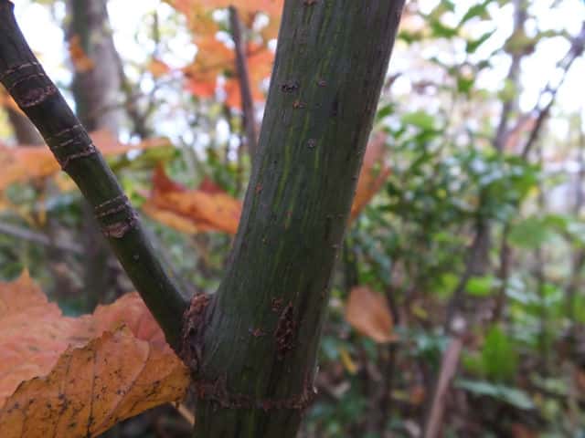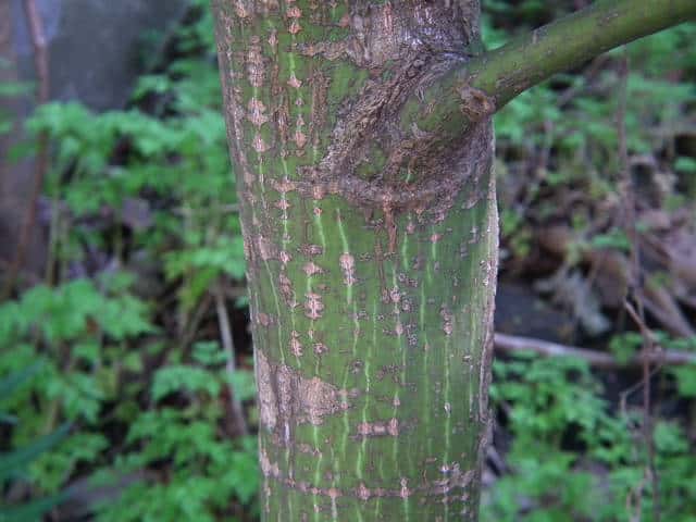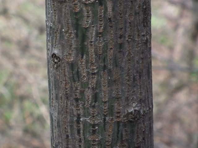 | ▼枝は緑色。 | ▼上部の樹皮には菱形状の皮目がある。 | ▼下部の樹皮は縦に浅く裂ける。 |