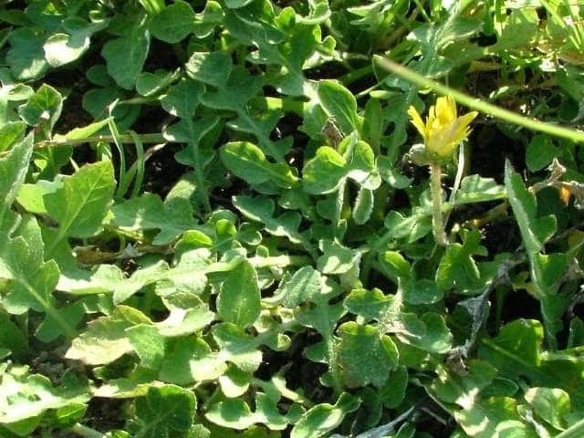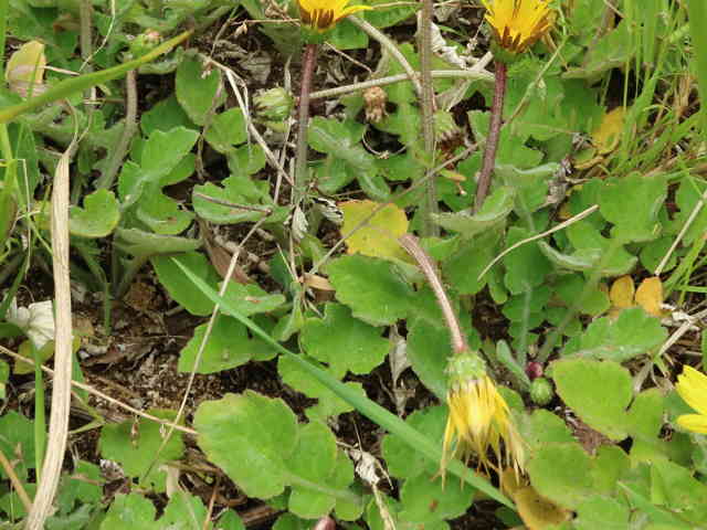 | 多年草 南アフリカ原産。高さ20〜40cm。全体に毛が多い。葉は厚く、タンポポのように深く切れ込む。葉裏には白毛が密生する。頭花は直径約4cm。舌状花や筒状花は鮮黄色で、総苞外片の先が黒く細く尖る。花後盛んに匍匐枝を伸ばして四方に広がる。花期は4〜10月。 学名は、Arctotheca prostrata キク科ワタゲハナグルマ属 似たものにワタゲハナグルマ(Arctotheca calendula)があり、中央部の筒状花が暗紫色。参考サイト(Victorian Resources Online) |