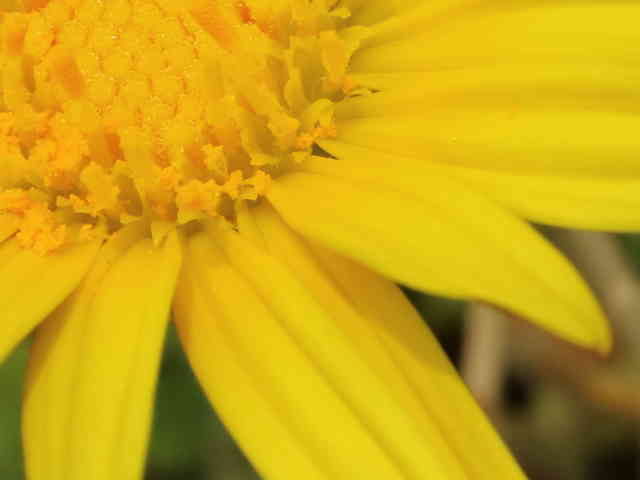 | ▼2017年5月11日 大東 | ▼舌状花も筒状花も黄色。 | ▼筒状花は両性、舌状花に雌しべが見えない。 |
