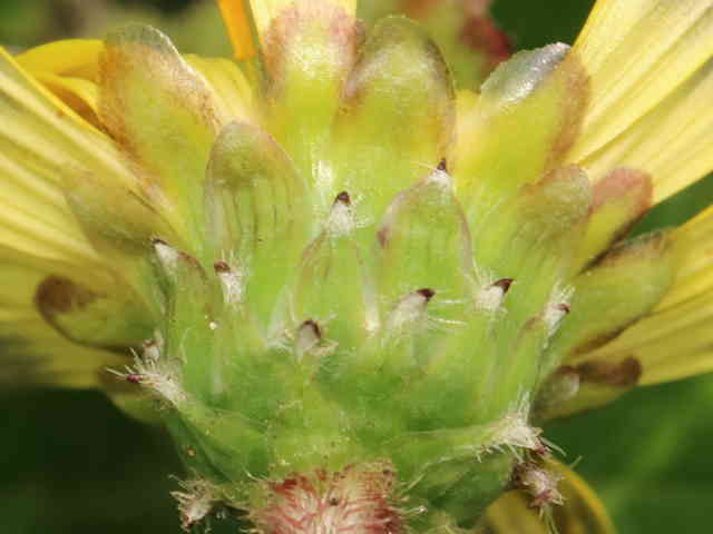 | ▼筒状花(上)と舌状花(下)。 | ▼総苞外片の先は尖り黒く、毛がある。 | |