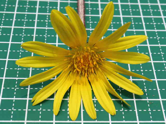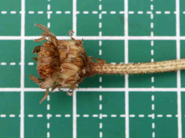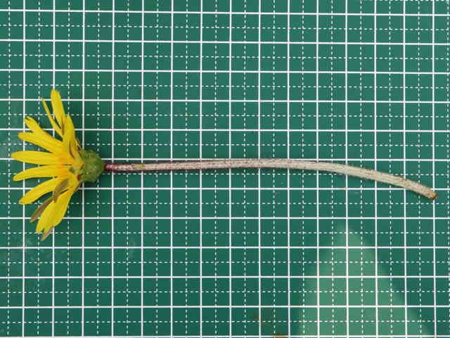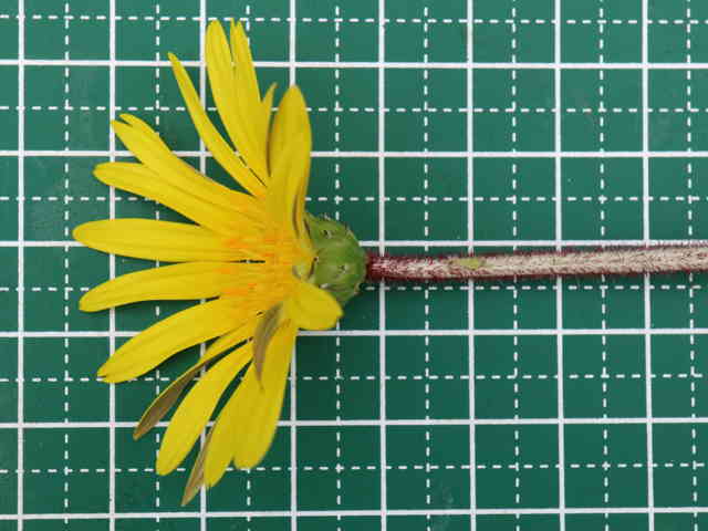 | ▼舌状花の裏面は褐色を帯びる。 | ▼花柄は長さ約11cm、毛が密生する。 | ▼頭花は直径約5.5cm、舌状花は長さ約2.5cm。 |