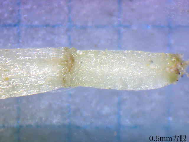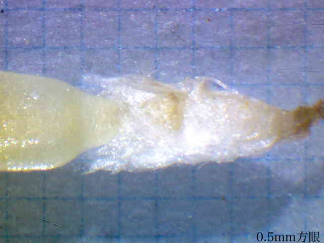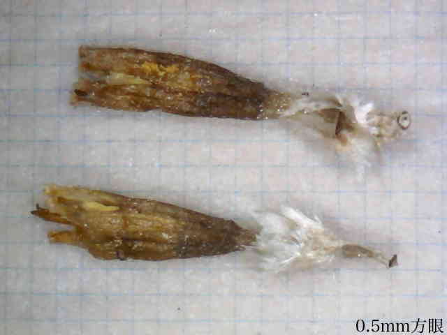 | ▼花後の頭花。 | ▼花後の筒状花、種子ができていない。 | ▼筒状花の鱗片状の冠毛。 |