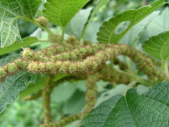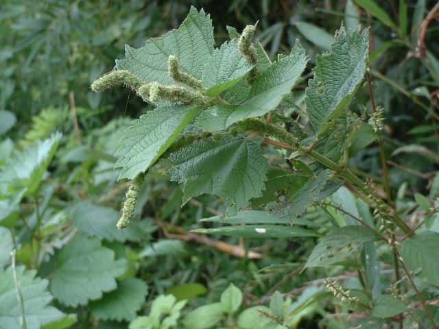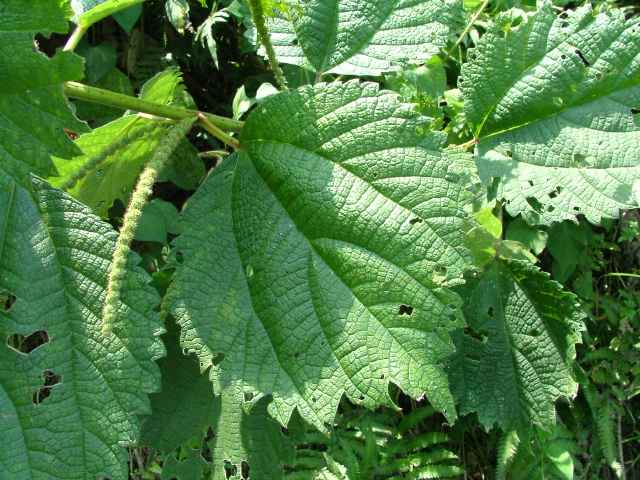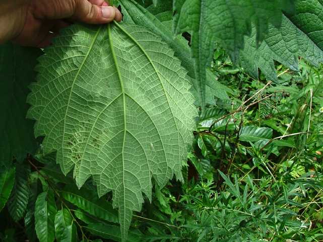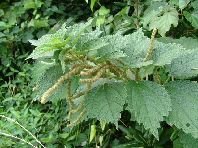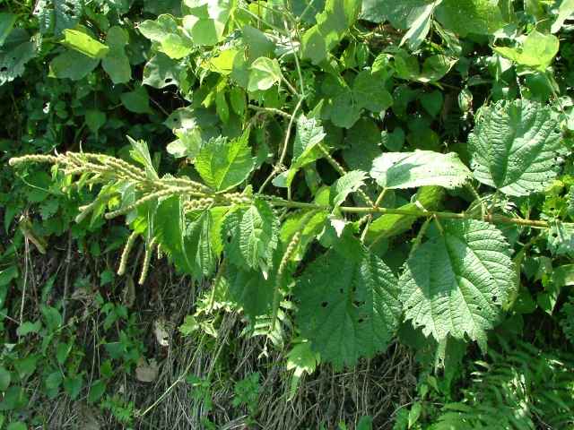 | 多年草 北海道〜九州の山野に生え、茎は高さ1〜1.2m。葉は対生し、長さ10〜15cmの卵状長楕円形〜卵形で、先は尾状にとがる。あらく鋭い鋸歯があり、上部ではしばしば重鋸歯になる。裏面には短毛が密生する。葉のわきから穂状花序を出し、茎の上部に雌花序、中部に雄花序をつけるが、雄花序をつけないものが多い。花には花弁がない。雌花は筒型の萼に包まれ、1本の花柱がある。雄花には雄しべ4本がある。花期は8〜10月。 学名は、Boehmeria longispica イラクサ科ヤブマオ属 似たものにメヤブマオがある。また海岸に、よく似たニオウヤブマオがあり、葉裏にビロード状の毛が密生し、はっきりとした雄花がついている。 |