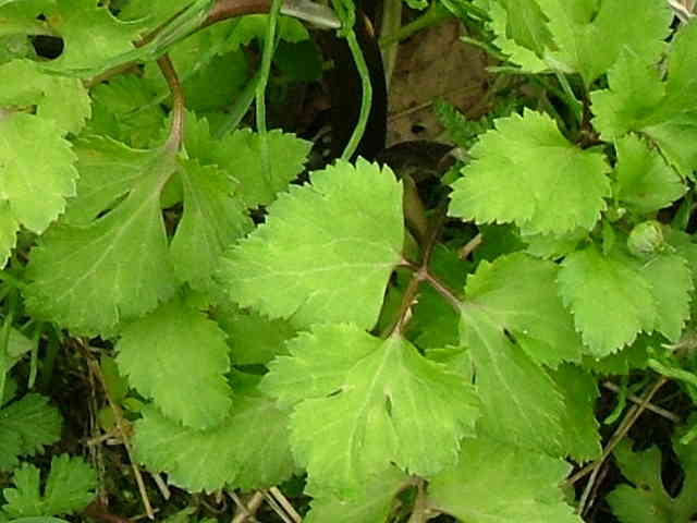 | 多年草 キツネノボタンの品種で八重咲きのものをヤエキツネノボタンという。別名 ヤエザキキツネノボタン。 学名は、Ranunculus silerifolius f. pleniflorus キンポウゲ科キンポウゲ属 [キツネノボタン] 日本各地の田の畦や溝の縁などに生え、高さ50〜60cm。葉は3出複葉で、両面に伏毛がある。根生葉には長い柄があり、小葉は2裂又は3裂し、不規則な鋸歯がある。茎葉は互生し、柄は短い。花は直径1〜1.5cmほどの黄色の5弁花。そう果は扁平な楕円形。先端は強く曲がる傾向がある。最近は花柱の先端の曲がり具合は同定のキーにならないとされ、そう果の稜がキーとなる。花期は4〜7月。 |