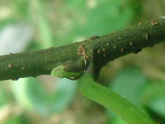 | ▼葉先がつき出し、粗い尖った鋸歯がある。 | ▼葉柄基部に托葉があるが、早くに落ちる。 | |