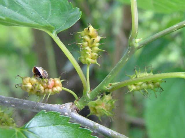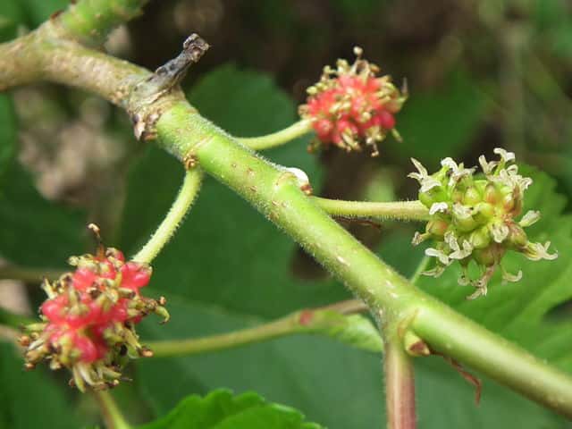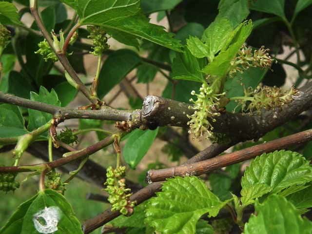 | 落葉低木 北海道〜琉球の低山地の林内に生える。高さ3〜10mになる。若枝は無毛。托葉は線状披針形または狭長楕円形で、先がとがり、長さ7〜12mm、背面に長い灰白色の軟毛が密生する。葉柄は長さ2〜3.5cmで無毛。葉身は卵状広楕円形でしばしば深く3〜5裂し、先は短く尾状にとがり、基部は切形または浅心形、長さ6〜14cm、幅4〜7cm、表面は脈上に短毛が散在するほかは無毛であるが、異形細胞の先が突出し、多数の微小な毛があるように見え、裏面は脈上に短毛が散生し、側脈の基部に軟毛がある。若枝下部の鱗片葉または葉のわきから1個ずつ尾状花序を伸ばす。雌雄異株まれに同株。雄花序の柄は長さ1cmほどであらい毛があり、雄花序は円筒形で長さ約2cm、幅5mm、無柄または短柄のある雄花をつける。雄花の花被片は卵形で先は鈍いく、背面にあらい毛があるほかは無毛。雌花序の柄は長さ4〜10mmであらい毛があり、雌花序は球形または楕円形で、長さ4〜6mm、幅5mm、多数の雌花をつける。雌花の花被片は円形で、縁に短毛が散生するほかは無毛。花柱は長さ約2〜2.5mmで、1〜1.5mmの柄があり、先は浅く2裂する。複合果は紫黒色に熟す。花期は4〜5月。(日本の野生植物) 冬芽は、卵形で長さ3〜6mm。芽鱗は4〜7個あり、淡褐色で無毛。葉痕は半円形〜扁円形。多数の維管束痕が輪状に並ぶ。(樹に咲く花) 学名は、Morus australis クワ科クワ属 よく似たマグワ(クワ)は雌雄異株あるいは同株で花柱がきわめて短い。 ヒメコウゾは葉柄が1cm弱と短く、鋸歯が細かい。ヤマグワ、マグワは葉柄が2cm以上あり、鋸歯が粗く尖る。 |