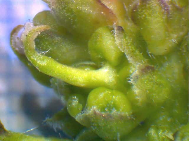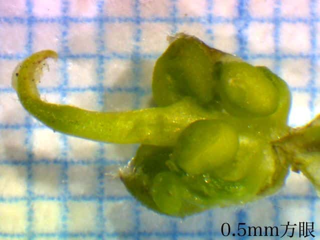 | ▼花の部分は長さ約1cm。 | ▼雌しべの周りに雄しべがある。 | |