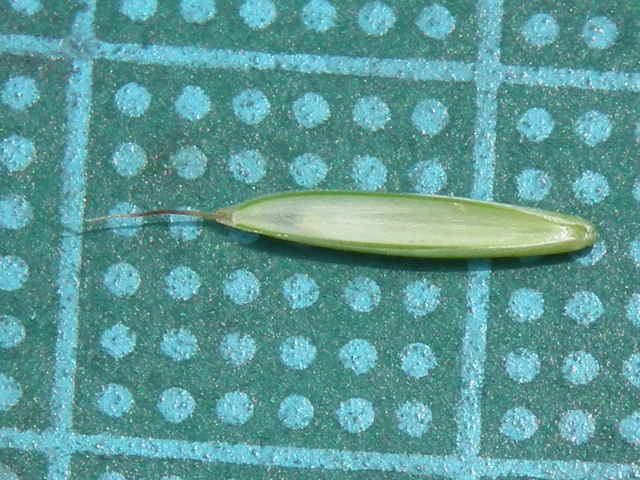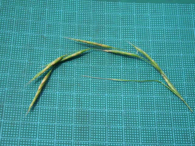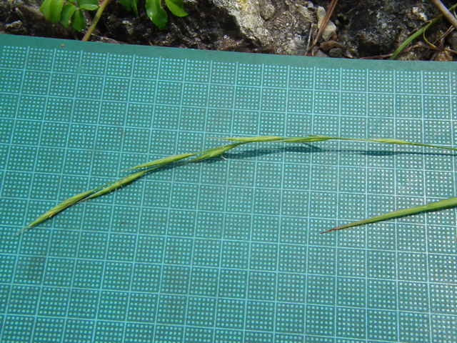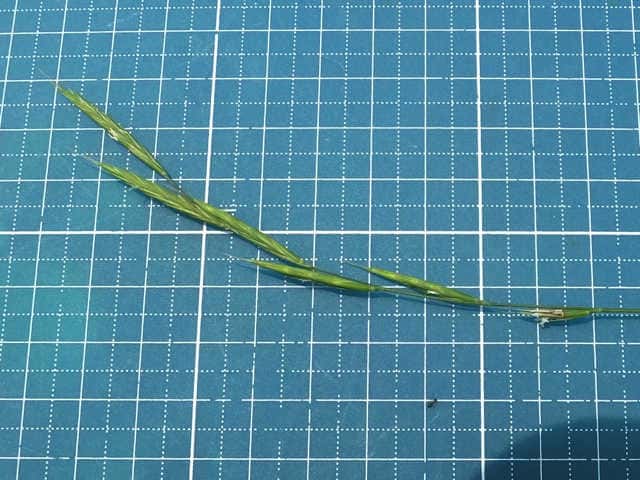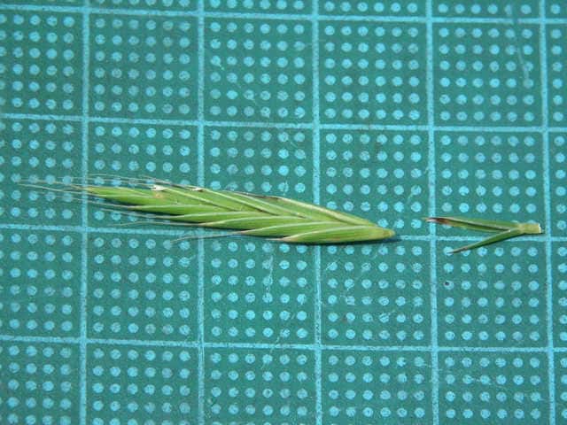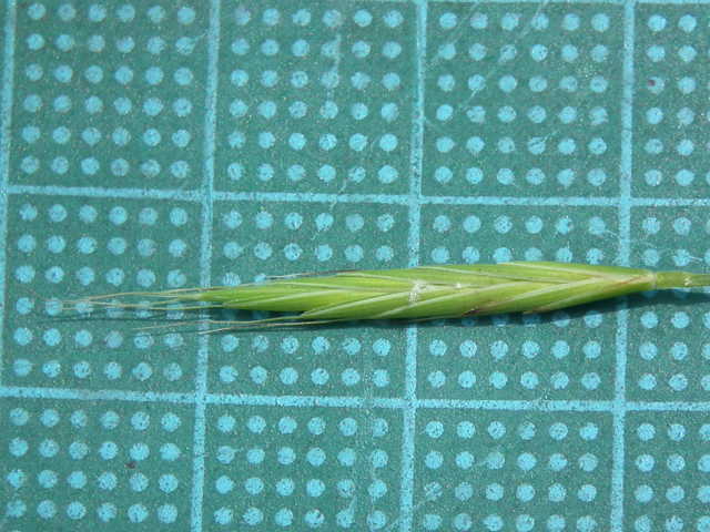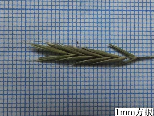 | ▼小穂は長さ2〜2.3cm。 | ▼8小花がある。(乾燥標本) | ▼第1苞穎は長さ約6mm、第2苞穎は7mm。 |