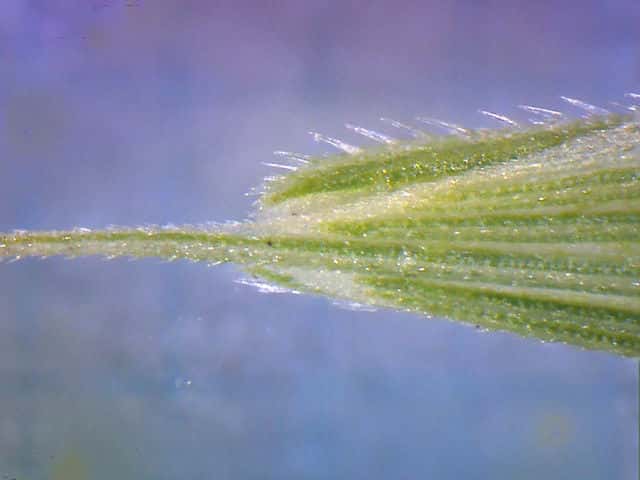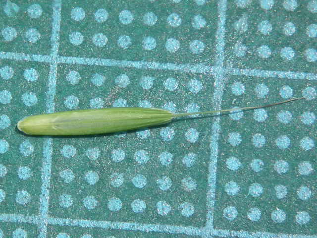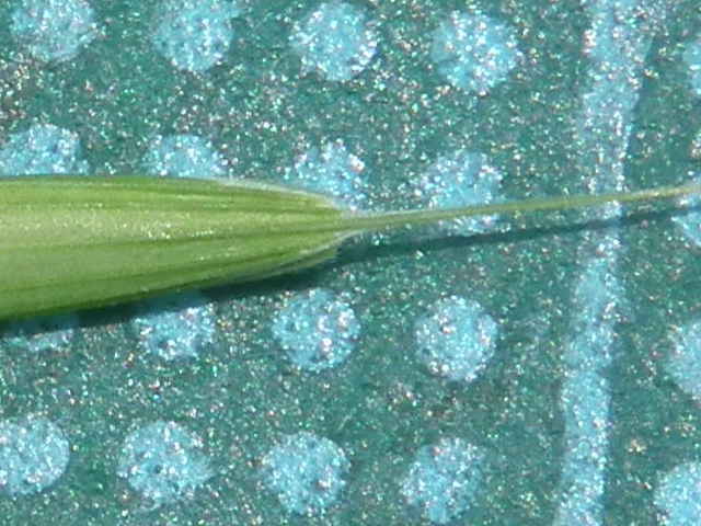 | ▼護穎には5〜6mmの芒がある。 | ▼護穎は長さ約9mm、内穎はほぼ同長。 | ▼護穎の先は芒となり、内穎の縁に毛がある。 |