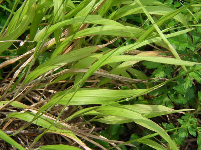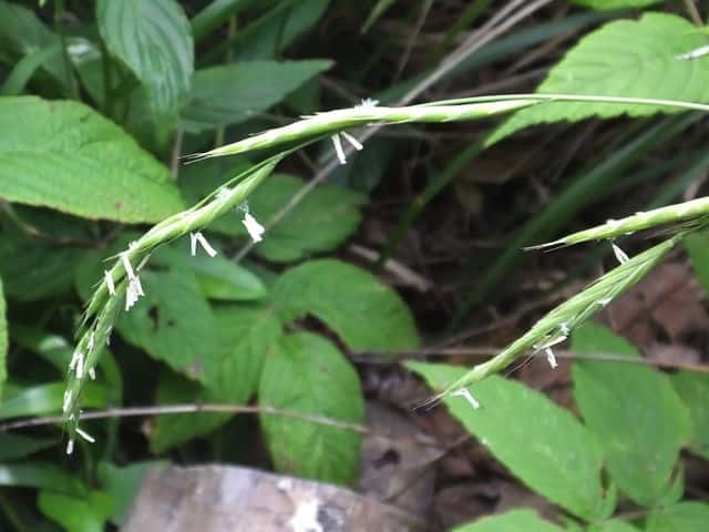 | 多年草 北海道〜九州の山地の丘陵〜山道のわき、あるいは林内に生育する。種子で繁殖し、散生する。根茎は短く、錯綜し、匍匐茎を欠き、越冬芽は地表にある。茎はやや倒伏または斜上して叢生し、細く平滑であるが、節に白い毛が密生する。葉身は線形で、両面の脈上と縁に毛がある。葉鞘は毛が密生する。花序は穂状で長さ7〜10cm、先端は下垂する。小穂は線状紡錘形で長さ15〜25mm、6〜8小花よりなる。小花は長さ7.5mm、第1苞頴は長さ4mm、第2苞頴は8.5mm。護穎と内頴はほぼ同長で護穎に長さ5〜10mmの芒がある。果実は広線形、乳褐色で長さ5.5〜7mm。花期は6〜7月。(日本イネ科植物図譜) 学名は、Brachypodium sylvaticum イネ科ヤマカモジグサ属 よく似たものにカモジグサ、アオカモジグサなどがある。 |