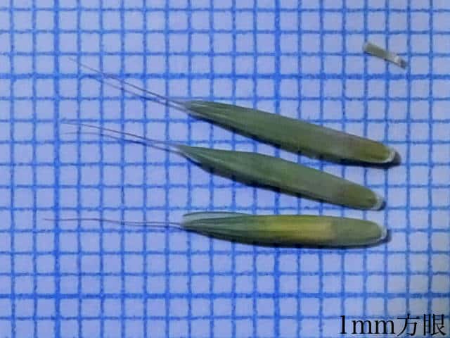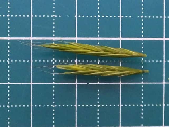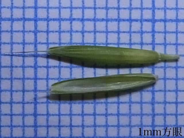 | ▼護穎には5〜10mmの芒がある。 | ▼護穎と内穎はほぼ同長。 | |